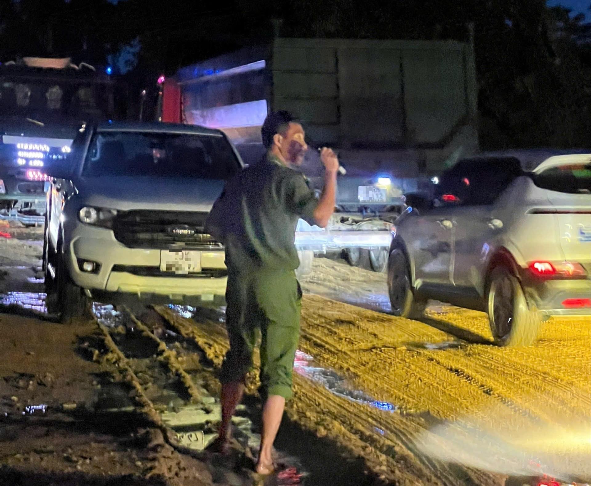 Lực lượng Công an xã Phan Sơn điều tiết các phương tiện lưu thông qua vị trí xảy ra sạt trượt