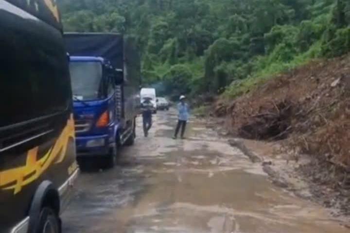 Do ảnh hưởng của mưa lớn kéo dài đã làm cho đất, đá trên núi sạt xuống phần đường đang thi công khiến các phương tiện không thể lưu thông qua vị trí này.