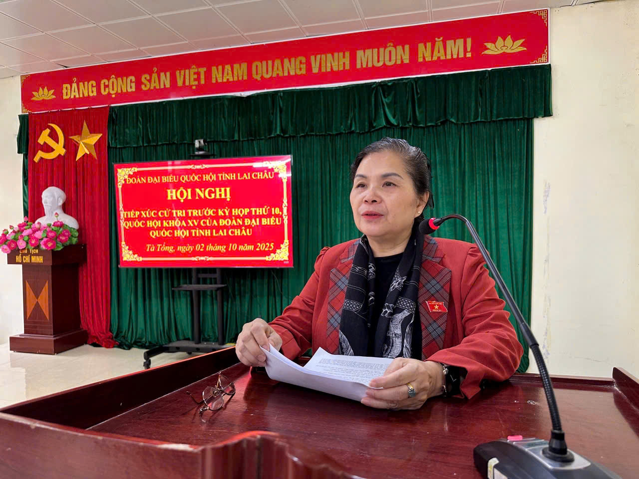 Tại buổi tiếp xúc, cử tri xã Tà Tổng đã kiến nghị nhiều nội dung liên quan trực tiếp đến đời sống dân sinh như: đầu tư, nâng cấp hệ thống giao thông, xây dựng cầu, kè chống sạt lở; kéo điện lưới quốc gia đến các điểm bản chưa có điện; hỗ trợ giống cây trồng, vật nuôi; xóa nhà tạm, nâng mức phụ cấp cho cán bộ thôn bản. Cử tri cũng phản ánh tình trạng ma túy diễn biến phức tạp, đề nghị có giải pháp đưa các đối tượng nghiện đi cai nghiện bắt buộc để đảm bảo an ninh trật tự. Ngoài ra, cử tri mong muốn sớm giải quyết chế độ chính sách cho người có công, cán bộ không chuyên trách nghỉ theo quy định; xem xét hỗ trợ đặc thù để thu hút cán bộ có trình độ công tác lâu dài tại địa phương.