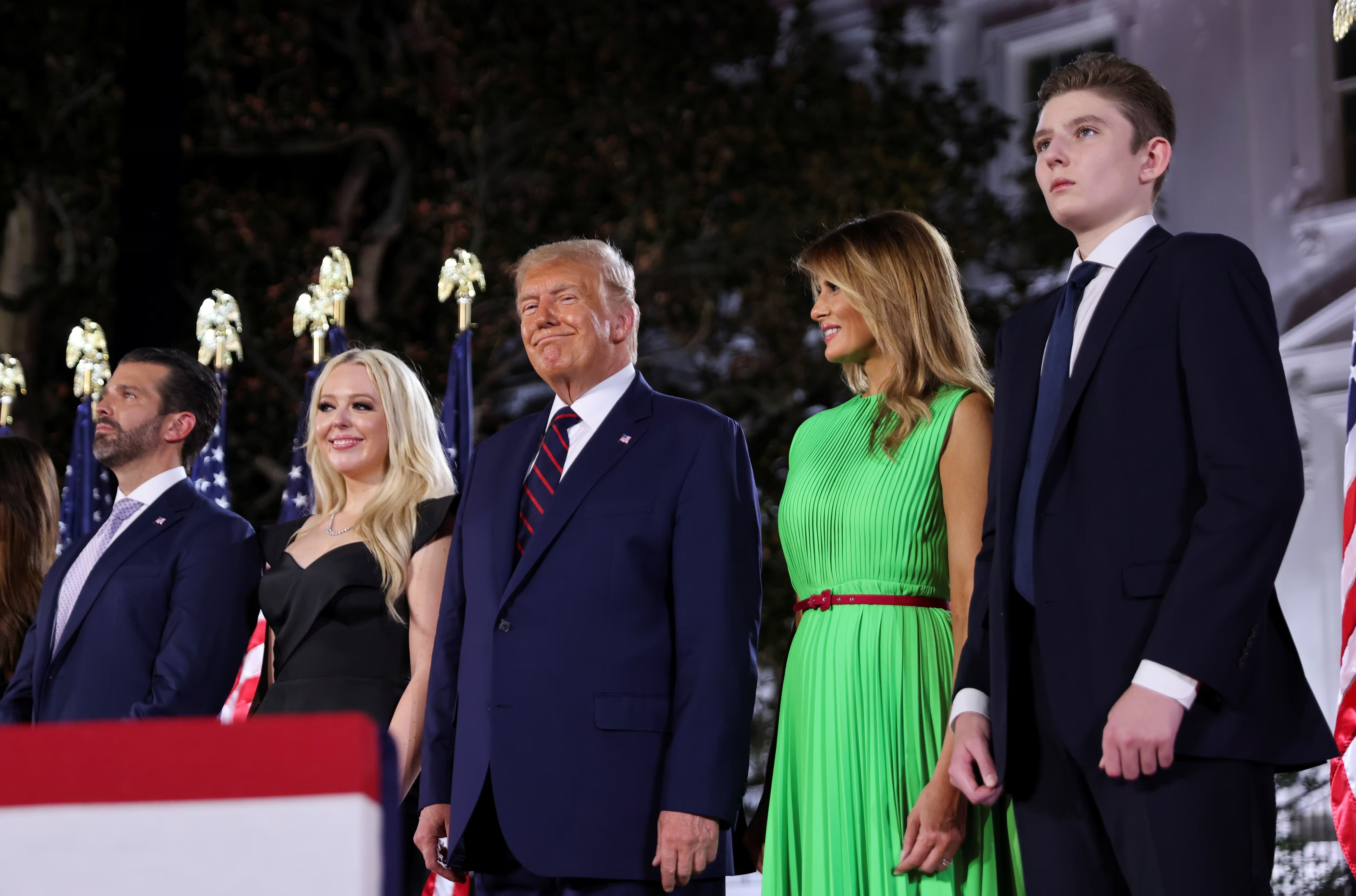 Tổng thống Mỹ Donald Trump bên cạnh đệ nhất phu nhân Melania Trump và các thành viên trong gia đình vào năm 2020. Ảnh: Reuters.