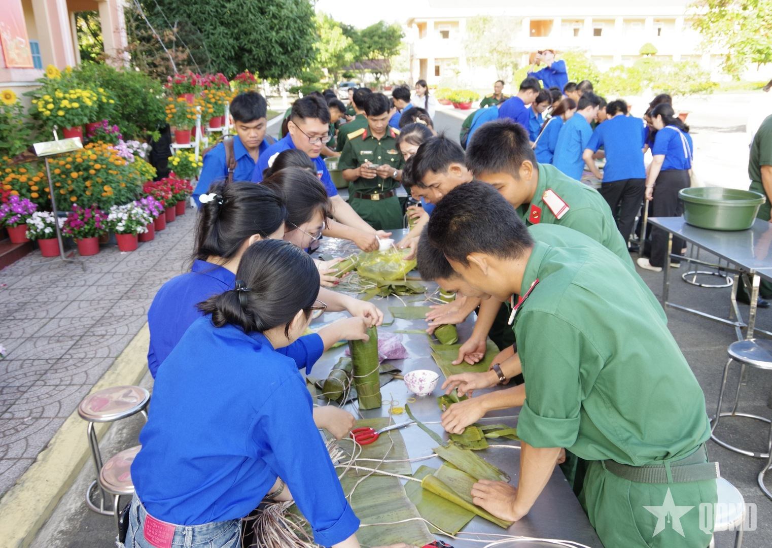 Không khí sôi nổi tại Hội thi gói bánh tét với chủ đề “Hương vị miền Tây - Ấm tình quân ngũ”.