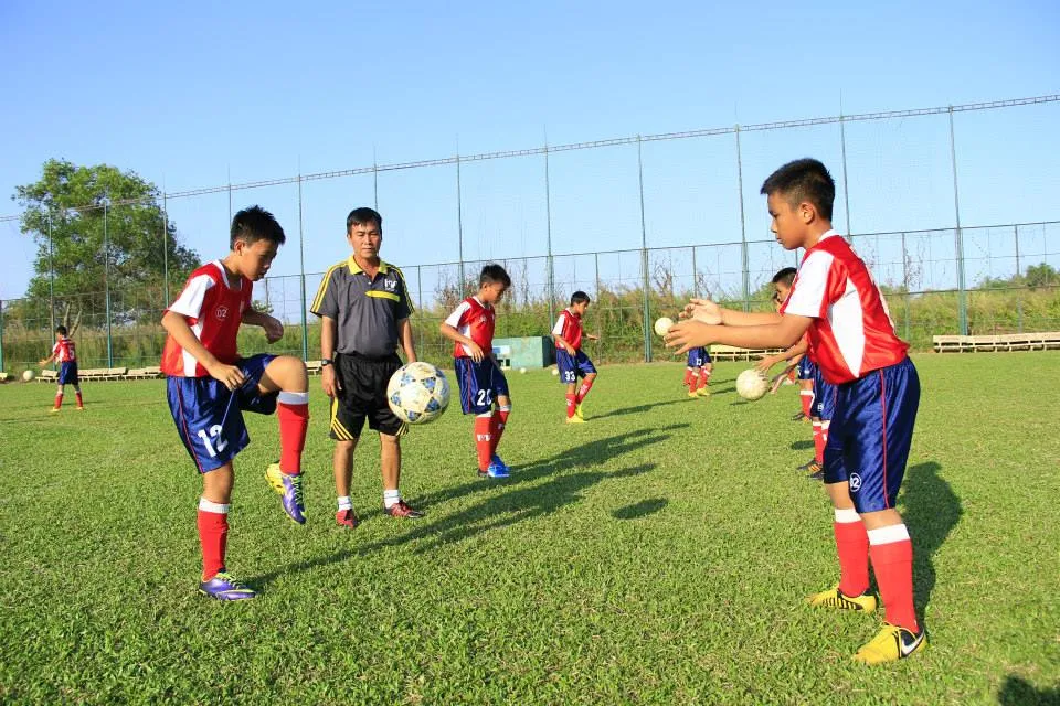 Cựu cầu thủ Cảng Sài Gòn truyền lửa đam mê cho lứa cầu thủ nhí. Ảnh: NA.