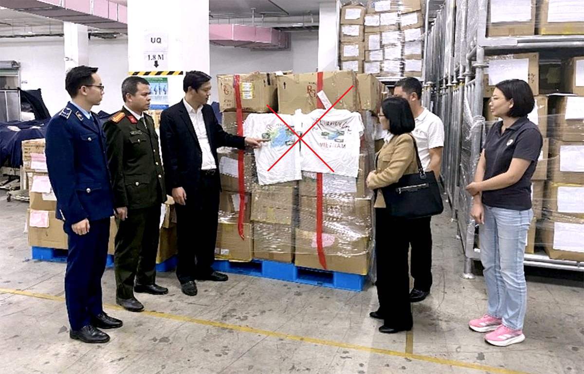 Cơ quan chức năng kiểm tra lô hàng áo phông có hình bản đồ Việt Nam nhưng thiếu Hoàng Sa, Trường Sa. Ảnh: K.T