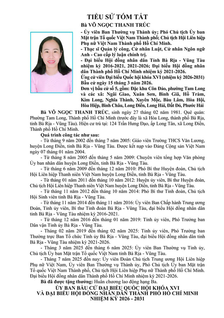 Dưới đây là tiểu sử tóm tắt và chương trình hành động của bà Võ Ngọc Thanh Trúc.
