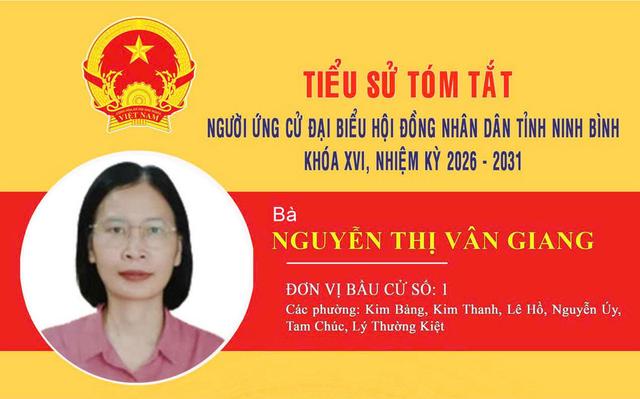 Báo Ninh Bình điện tử trân trọng giới thiệu tóm tắt tiểu sử ứng cử viên đại biểu Hội đồng nhân dân tỉnh Ninh Bình nhiệm kỳ 2026-2031 Nguyễn Thị Vân Giang, thuộc Đơn vị bầu cử số 1.