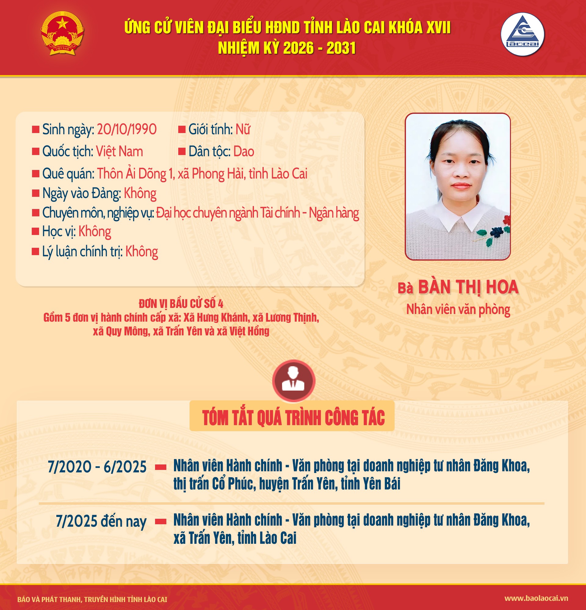 Tiểu sử tóm tắt những người ứng cử đại biểu HĐND tỉnh Lào Cai khóa XVII, nhiệm kỳ 2026 - 2031 (Đơn vị bầu cử số 4)