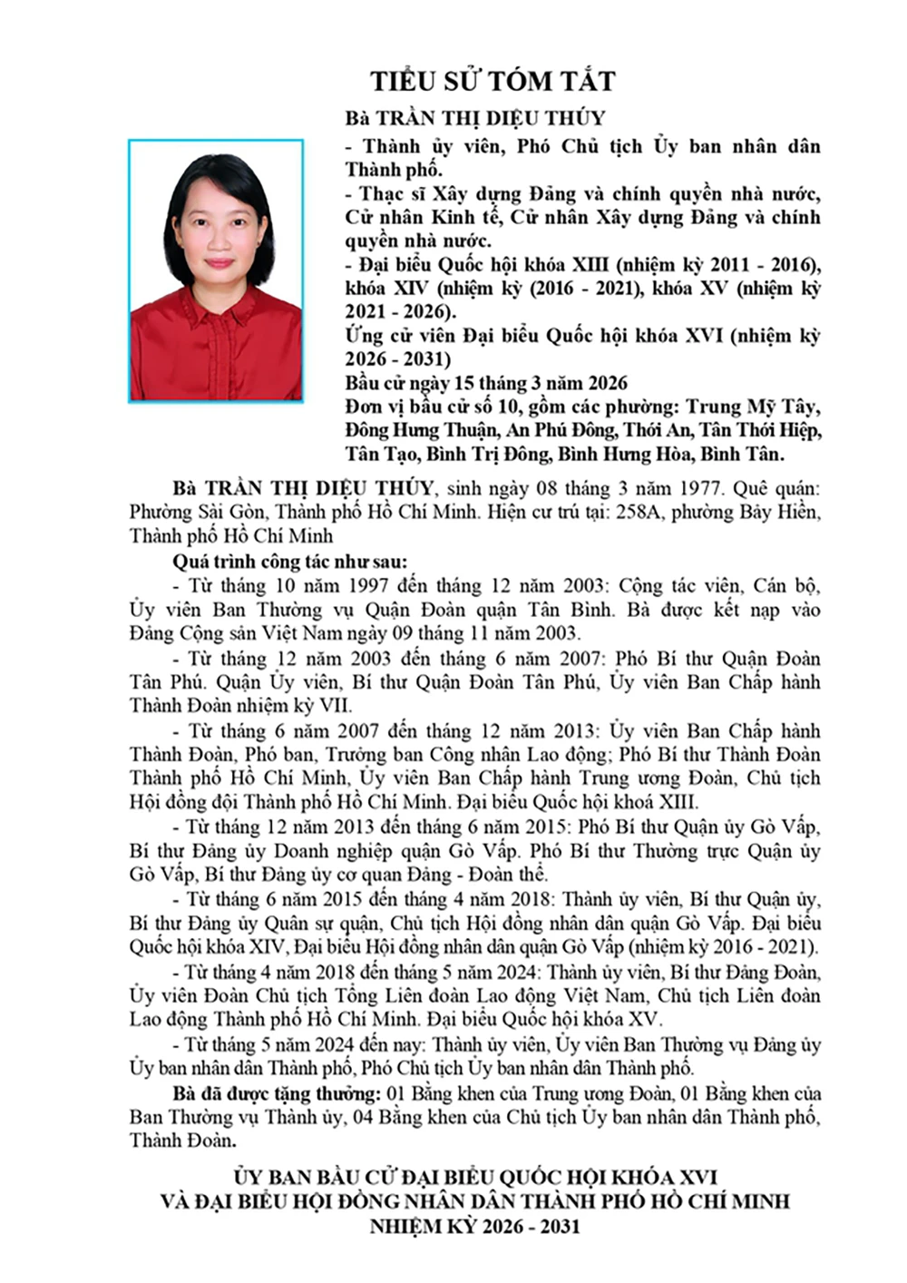 Bà Trần Thị Diệu Thúy, Phó Chủ tịch UBND TP.HCM, ứng cử đại biểu Quốc hội tại đơn vị bầu cử số 10.