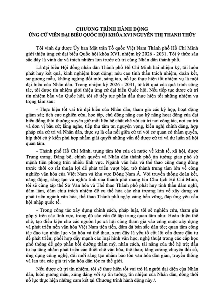 Bà Nguyễn Thị Thanh Thúy, Phó Giám đốc Sở Văn hóa và Thể thao TP.HCM, ứng cử đại biểu Quốc hội khóa XVI tại đơn vị bầu cử số 4 TP.HCM.