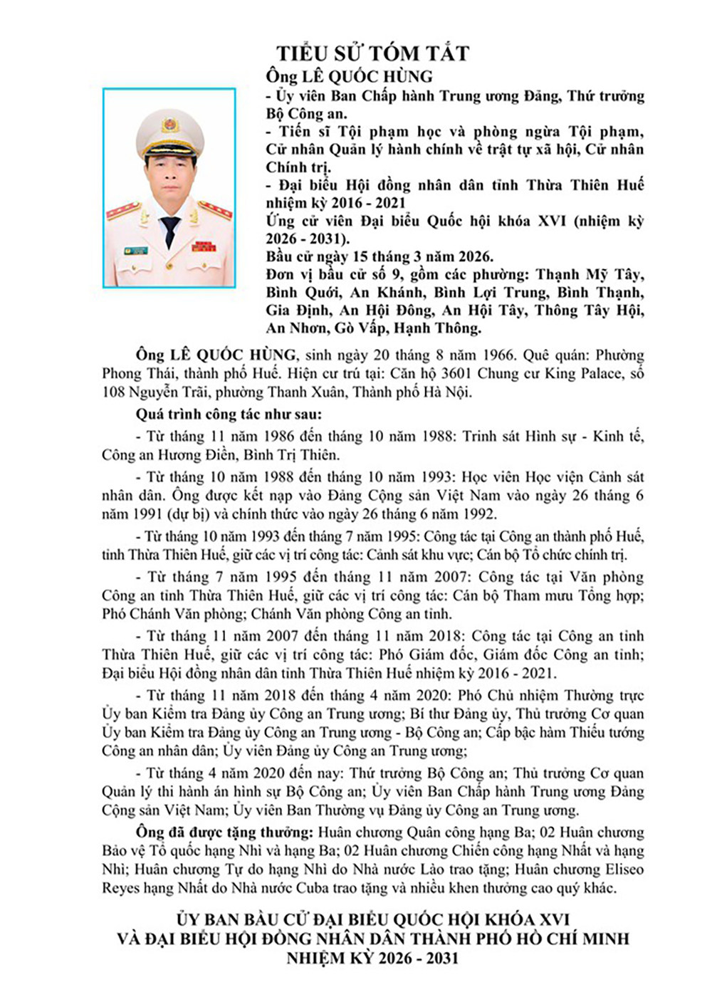 Thượng tướng Lê Quốc Hùng, Thứ trưởng Bộ Công an, ứng cử Đại biểu Quốc hội Khóa XVI tại đơn vị bầu cử số 9 TP.HCM, gồm các phường: Thạnh Mỹ Tây, Bình Quới, An Khánh, Bình Lợi Trung, Bình Thạnh, Gia Định, An Hội Đông, An Hội Tây, Thông Tây Hội, An Nhơn, Gò Vấp, Hạnh Thông.