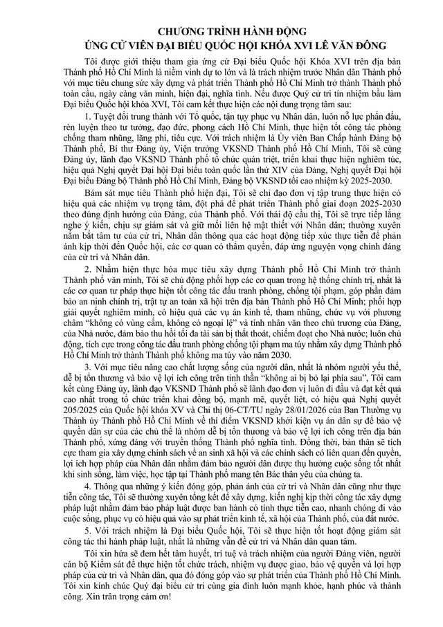 Ông Lê Văn Đông, Viện trưởng VKSND TP.HCM ứng cử đại biểu Quốc hội khóa XVI tại đơn vị bầu cử số 7 gồm các phường: Xóm Chiếu, Khánh Hội, Vĩnh Hội, Tân Hưng, Cát Lái, Tân Mỹ, Tân Thuận, Phú Thuận và các xã: Nhà Bè, Hiệp Phước, Cần Giờ, Bình Khánh, An Thới Đông, Thạnh An.