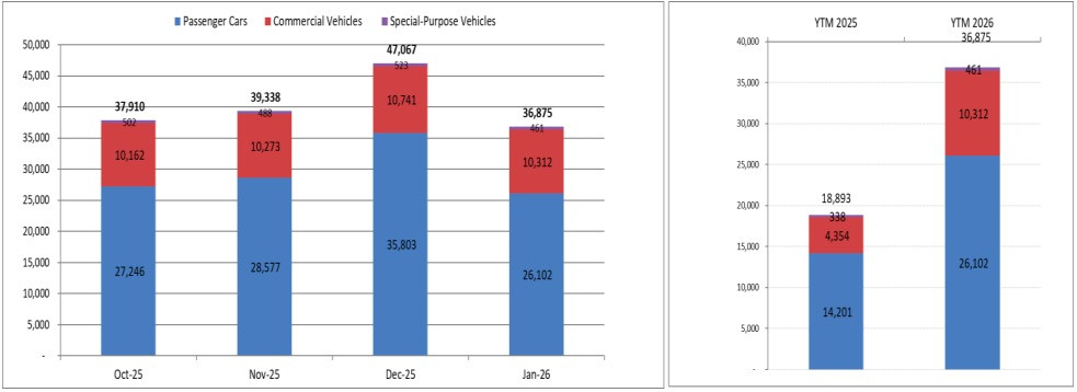 Theo báo cáo của Hiệp hội các nhà sản xuất ô tô Việt Nam (VAMA) mới công bố chiều nay (11/2), tổng doanh số bán hàng của các thành viên VAMA trong tháng đầu tiên của năm mới 2026 đạt 36.875 chiếc, bao gồm 26.102 xe du lịch, 10.312 xe thương mại và 461 xe chuyên dụng.