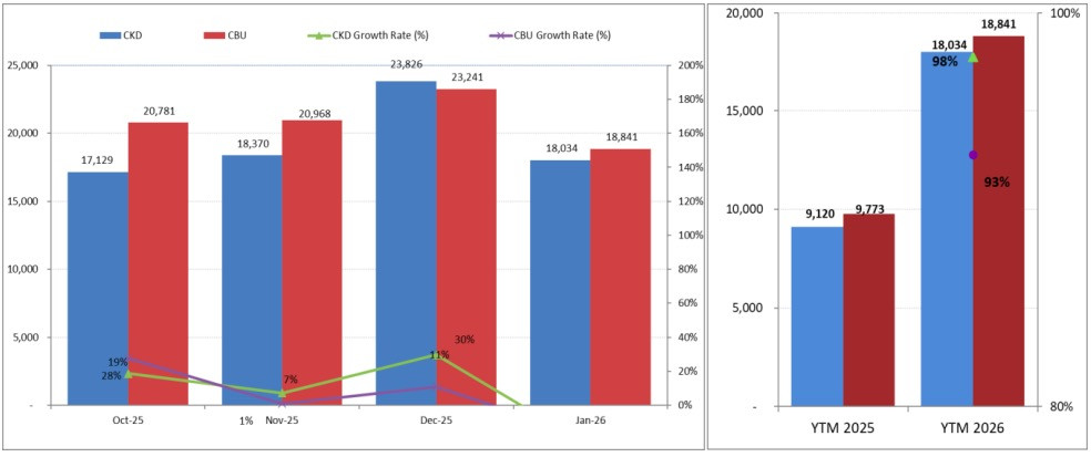 So với tháng cao điểm liền trước (tháng 12/2025 có tổng doanh số 47.067 chiếc), lượng bán ra thị trường của các thành viên VAMA trong tháng 1 đã giảm 22%; tuy vậy vẫn cao gần gấp đôi so với cùng kỳ năm 2025 (18.893 chiếc).