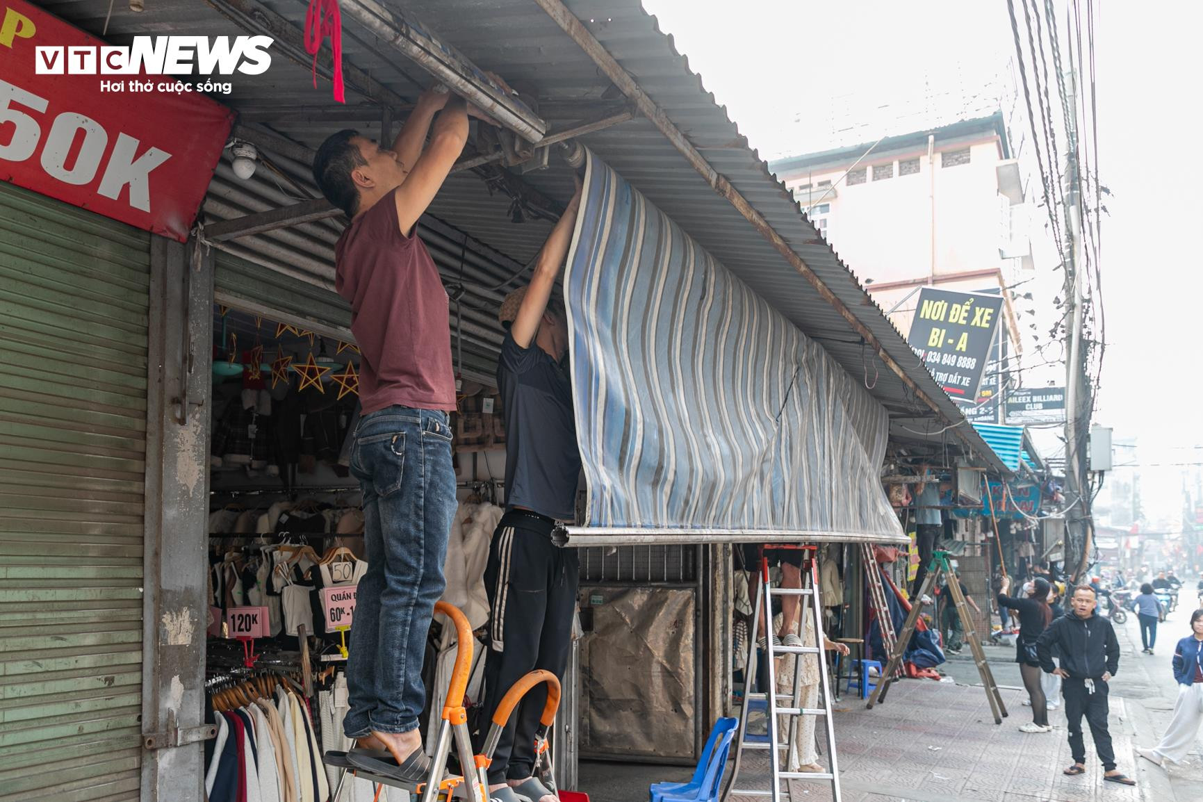 Một số tiểu thương tạm thời đóng cửa kinh doanh để gỡ mái che, sắp xếp lại hàng hóa theo quy định.
