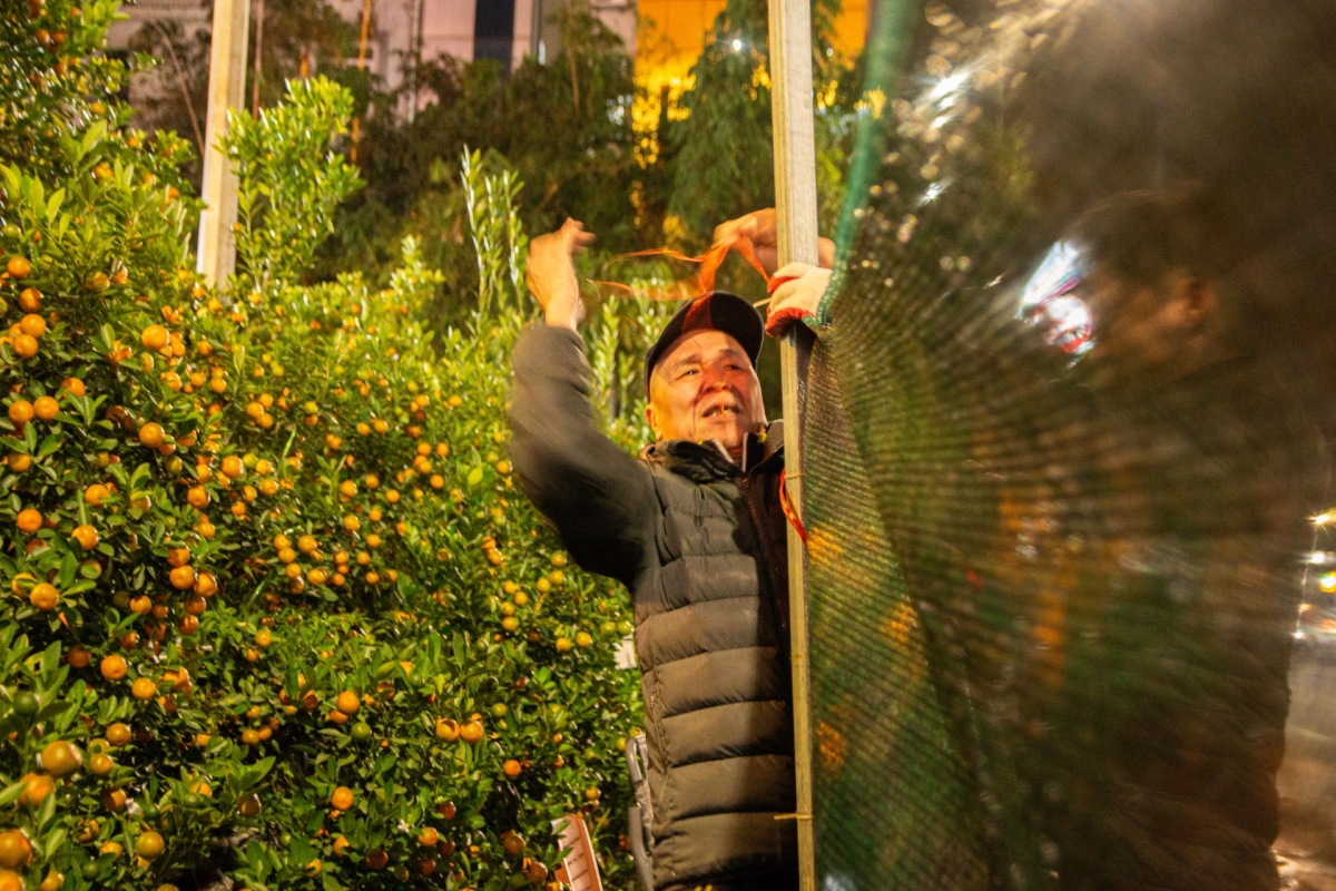 Đang dựng bạt, che chắn kín xung quanh gian hàng vừa để cản gió lạnh, vừa đảm bảo an toàn cho những vườn cây cảnh đang độ nở hoa, đơm trái tại chợ hoa cây cảnh Vạn Phúc (Hà Đông, Hà Nội) ông Nguyễn Sùng Dương (66 tuổi, Ngô Quyền, Hà Đông) cho biết khoảng 10 ngày qua, ông tạm gác công việc buổi tối để tập trung trông coi, bán đào, quất phụ giúp hai người em ruột của mình.