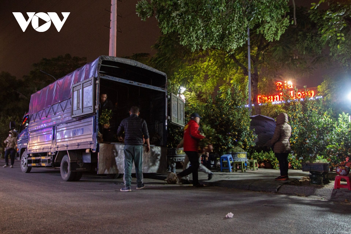 Nửa đêm, nhiều tiểu thương nơi đây vẫn miệt mài nhập hàng, chuyển những chậu cây, quất, đào để kịp thời phục vụ nhu cầu mua sắm tăng cao của người dân trong những ngày cận Tết.