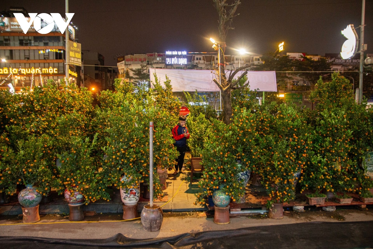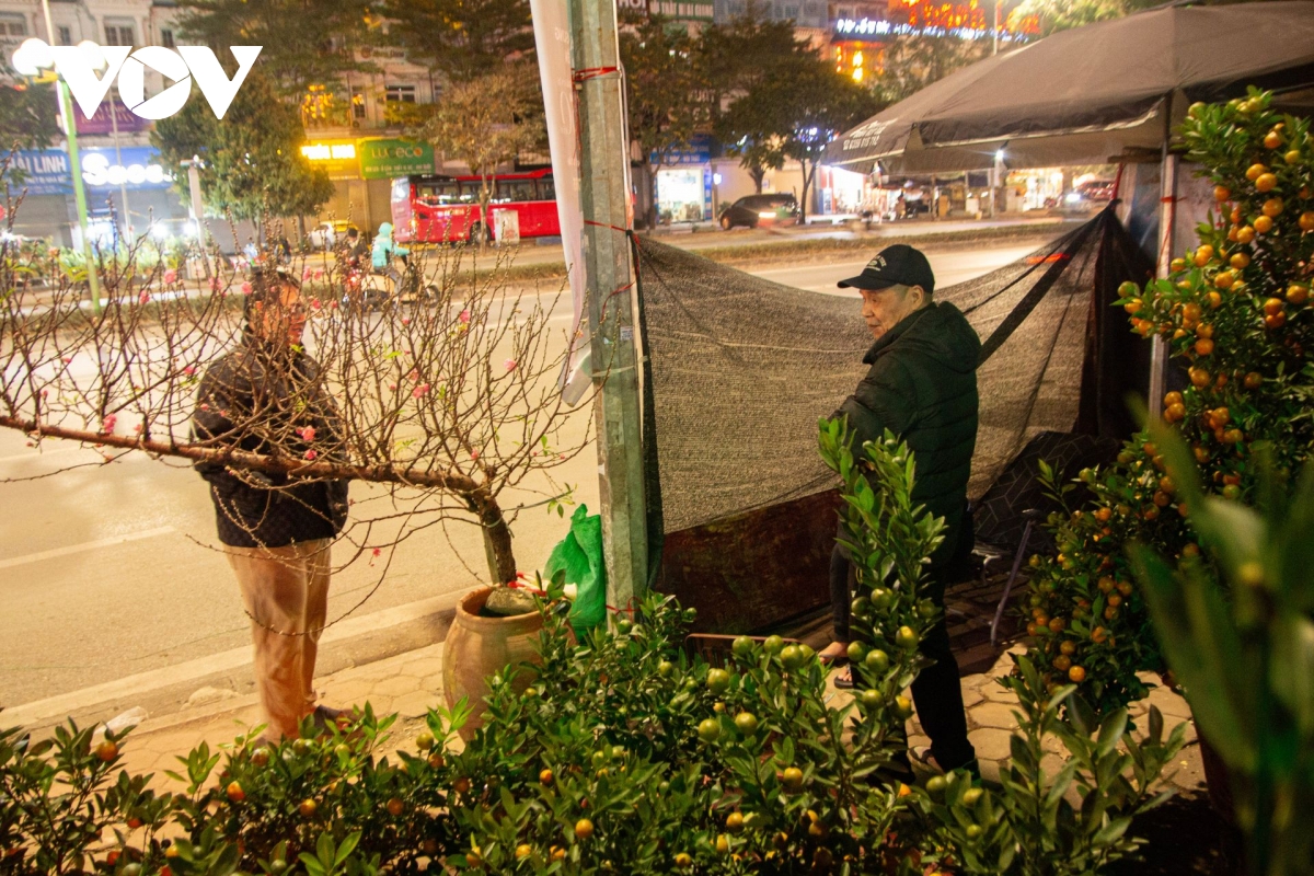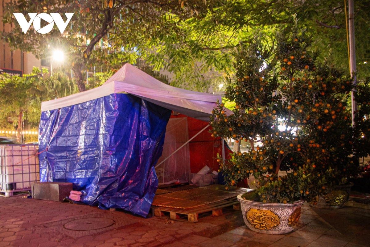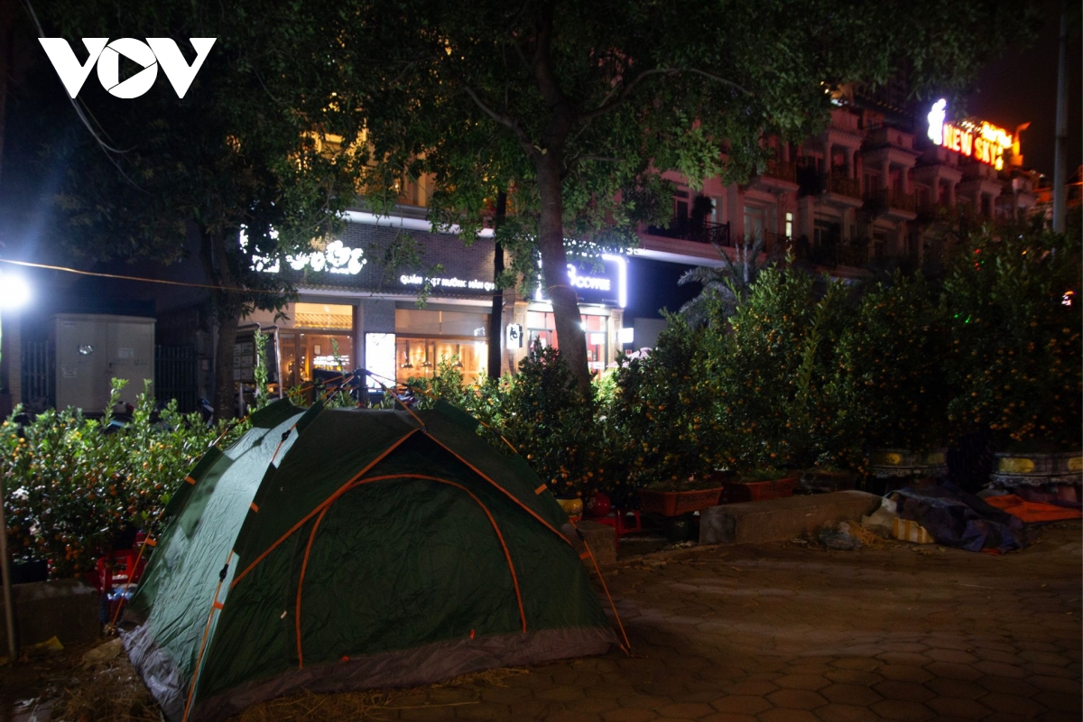 Theo ghi nhận của phóng viên trong đêm 22 và rạng sáng 23/1, dọc các tuyến đường như Tố Hữu, Võ Chí Công, Lạc Long Quân..., hàng chục chiếc lều đã được dựng lên để người bán đào, quất nghỉ ngơi và thay nhau thức đêm trông coi cây cảnh.