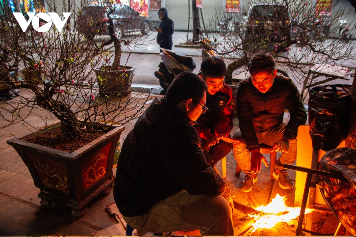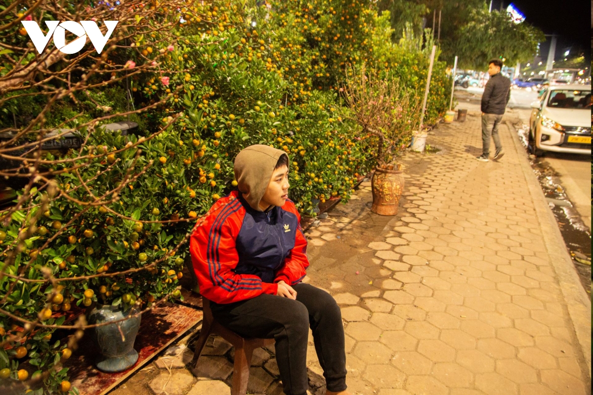 Cạnh gian hàng của ông Dương, Nguyễn Hải Phong (SN 2006, người trông đào, ngồi giữa) nhóm lửa sưởi ấm, vừa chống rét vừa tránh buồn ngủ cùng hai người bạn đồng hành trong đêm. Phong cho biết, được bố mẹ giao nhiệm vụ trông đào, gia đình đã đưa đào xuống phố bán từ khoảng 5 ngày trước. Tranh thủ thời gian đang nghỉ học, Phong phụ bố mẹ cùng các anh trông đào từ 19h tối hôm trước đến 6h sáng hôm sau rồi về nhà ngủ bù.