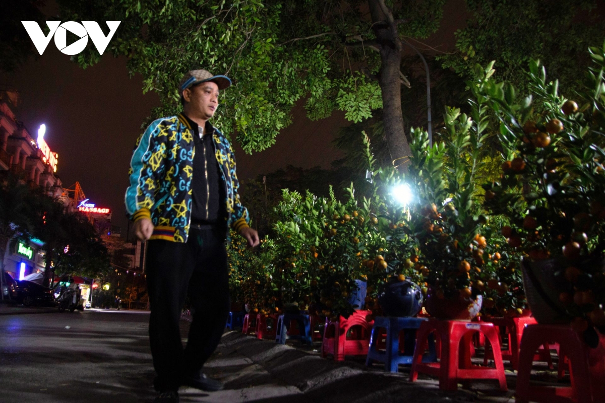 “Đêm nào tôi cũng canh từ 8 giờ tối đến 8 giờ sáng hôm sau. Dựng lều thì có chỗ ngả lưng, nhưng cứ 40–50 phút lại phải dậy đi kiểm tra một lần. Tối nay mới có thêm một cháu ra trông cùng, chứ những hôm trước tôi trông một mình. Không đi kiểm tra thì không yên tâm, cây quất chậu to thì không lo, chứ chậu nhỏ sợ thanh niên đêm khuya đi qua tiện tay bê mất”, ông Dương chia sẻ.