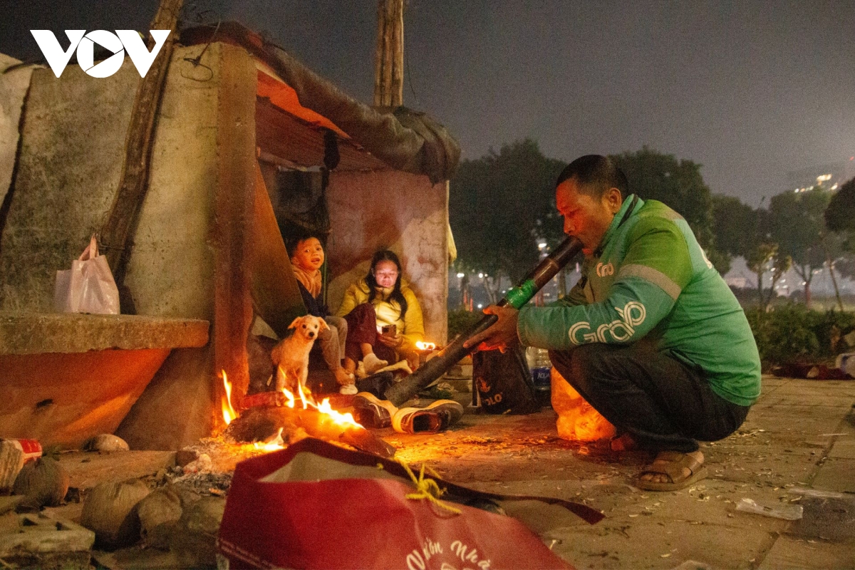 Nhiệt độ về đêm xuống thấp, chỉ còn khoảng 9 -10 độ C, các tiểu thương bám trụ trong những túp lều mong manh dựng tạm trên vỉa hè.