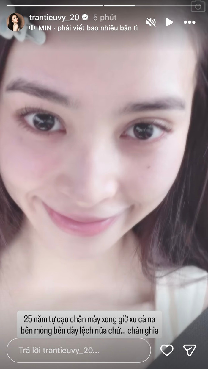 Trên trang cá nhân, Tiểu Vy bất ngờ chia sẻ về một sự cố khiến cô “dở khóc dở cười”. Người đẹp tâm sự "25 năm tự cạo chân mày xong giờ xu cà na, bên mỏng bên dày lệch nữa chứ... Chán ghê", kèm theo đó là bức ảnh cận mặt ghi lại diện mạo sau khi vô tình cạo lệch lông mày.