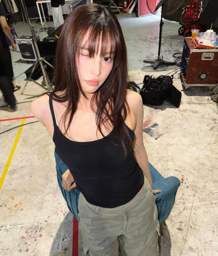 Tiểu Vy diện áo hai dây hở bạo, khoe visual mộc mạc ở hậu trường (Ảnh: ISNV).
