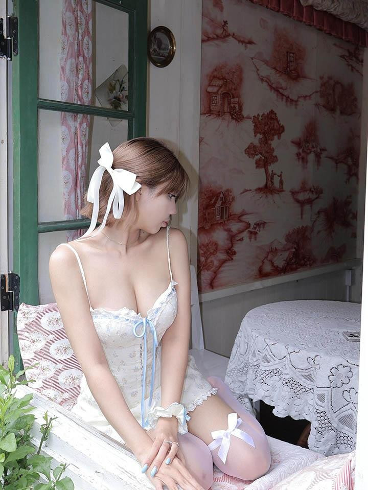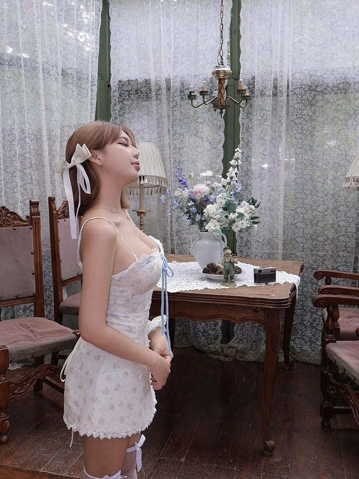 Hà Phương Boo khéo léo phối hợp với tất đùi màu trắng/hồng nhạt có chi tiết nơ ruy băng trắng ở phần cổ tất, cùng với chiếc nơ ruy băng trắng lớn cài tóc. Sự đồng điệu của phụ kiện màu trắng và nơ ruy băng làm tăng thêm vẻ ngoài cổ tích, "tiểu thư".