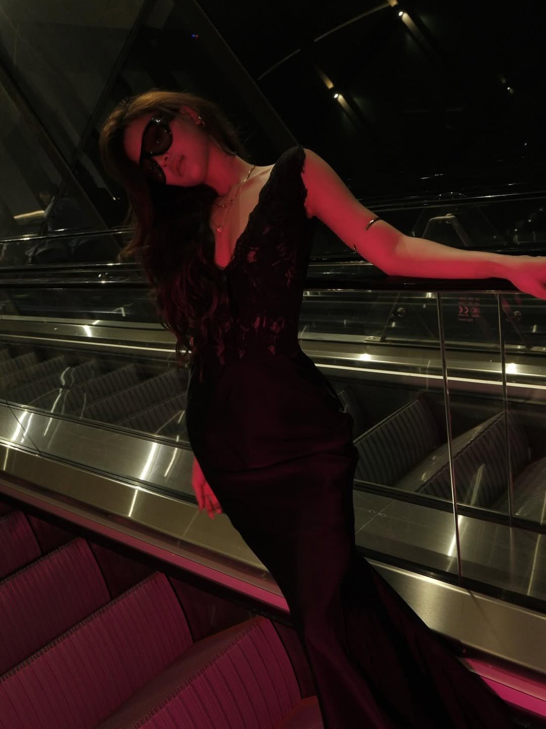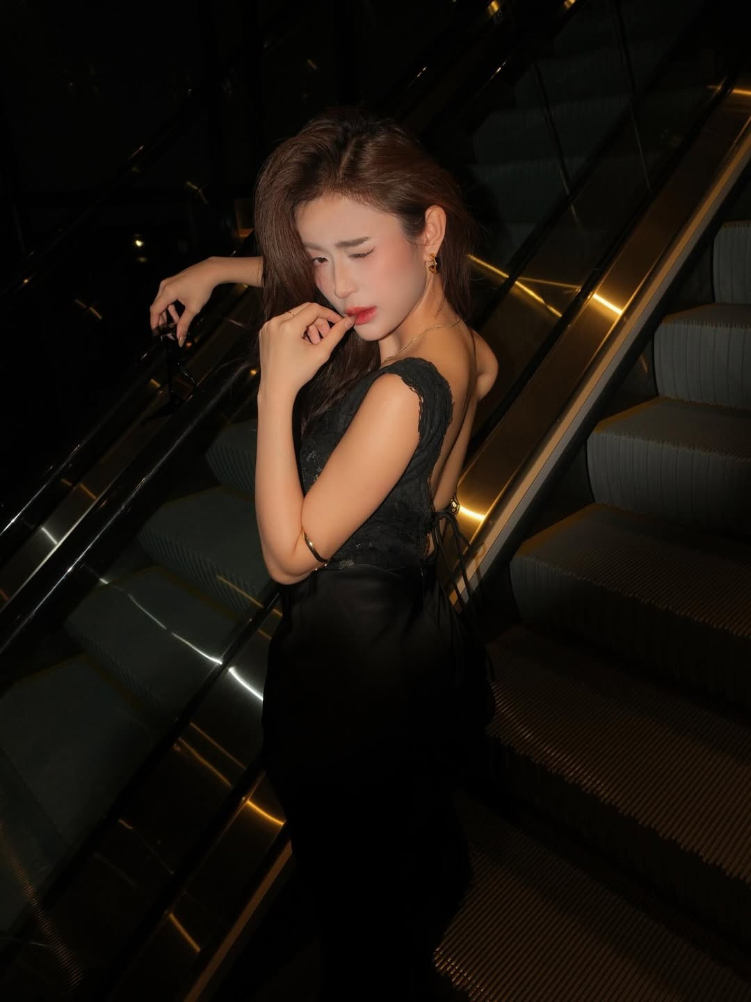Trong bộ ảnh, Mai Hà Hoàng Yến diện một chiếc đầm dài màu đen, chất liệu lụa hoặc satin mềm mại kết hợp với chi tiết ren lưới tinh tế ở phần thân trên. (Ảnh: IGNV)