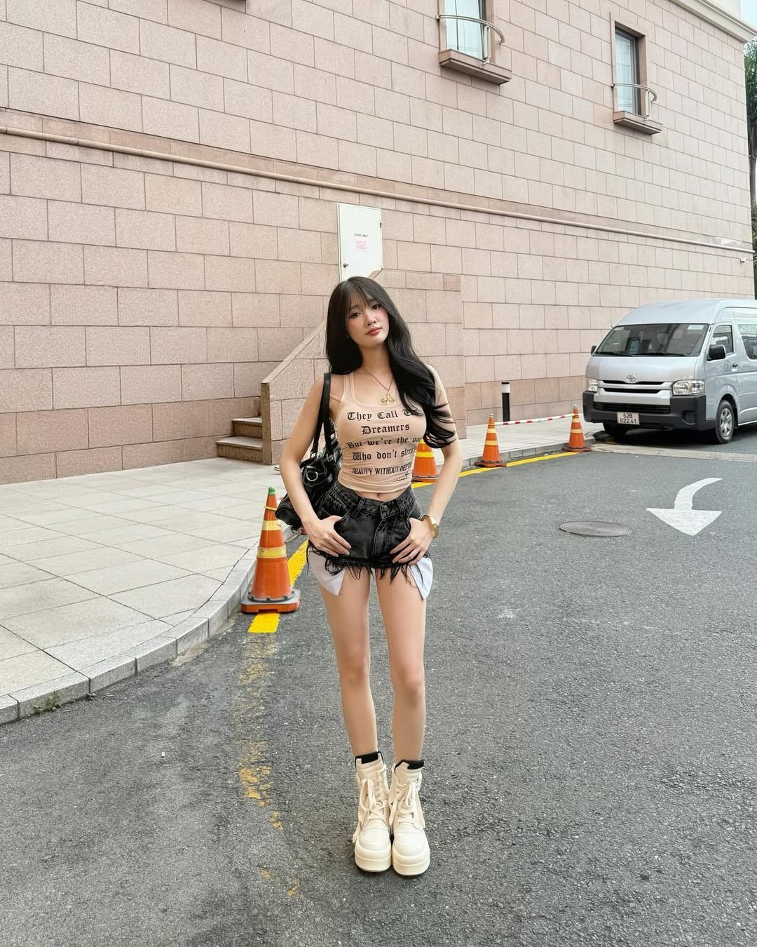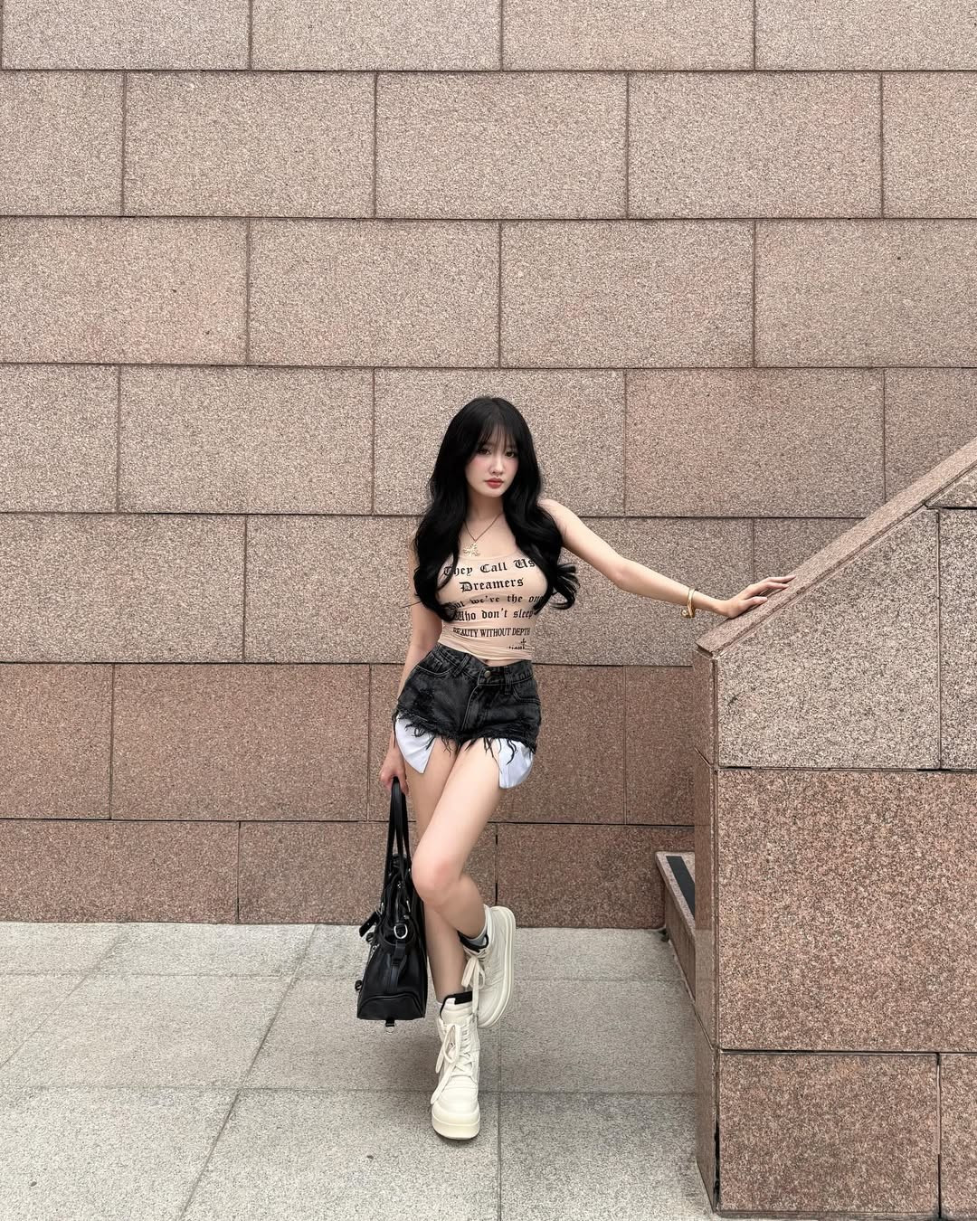 Cô nàng diện chiếc áo tank top in ôm sát chữ nổi, giúp khoe vòng eo thon gọn, kết hợp cùng quần shorts jean đen cạp cao và rách gấu. Sự kết hợp này mang đến vẻ ngoài bụi bặm, đậm chất đường phố. (Ảnh: IGNV)