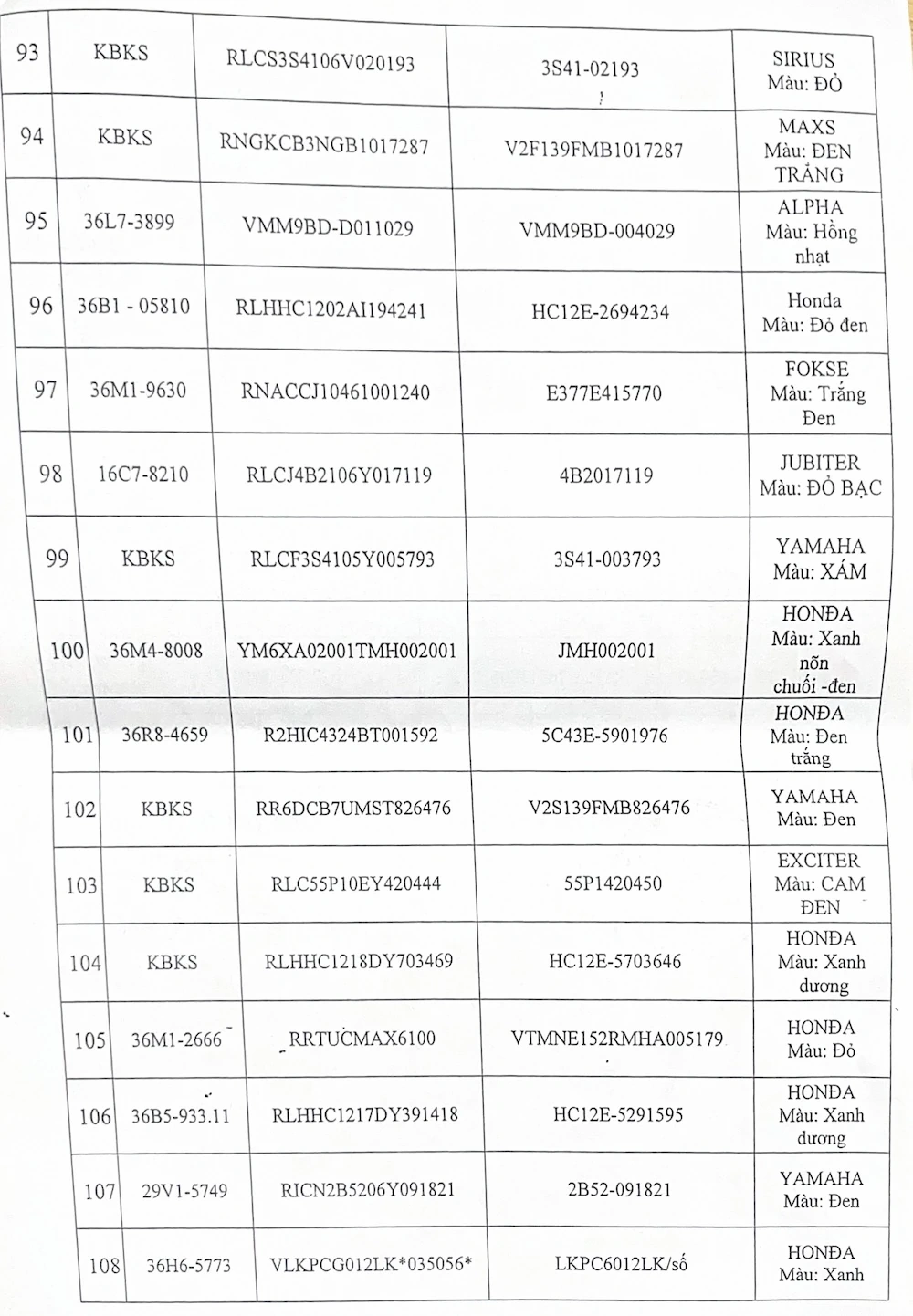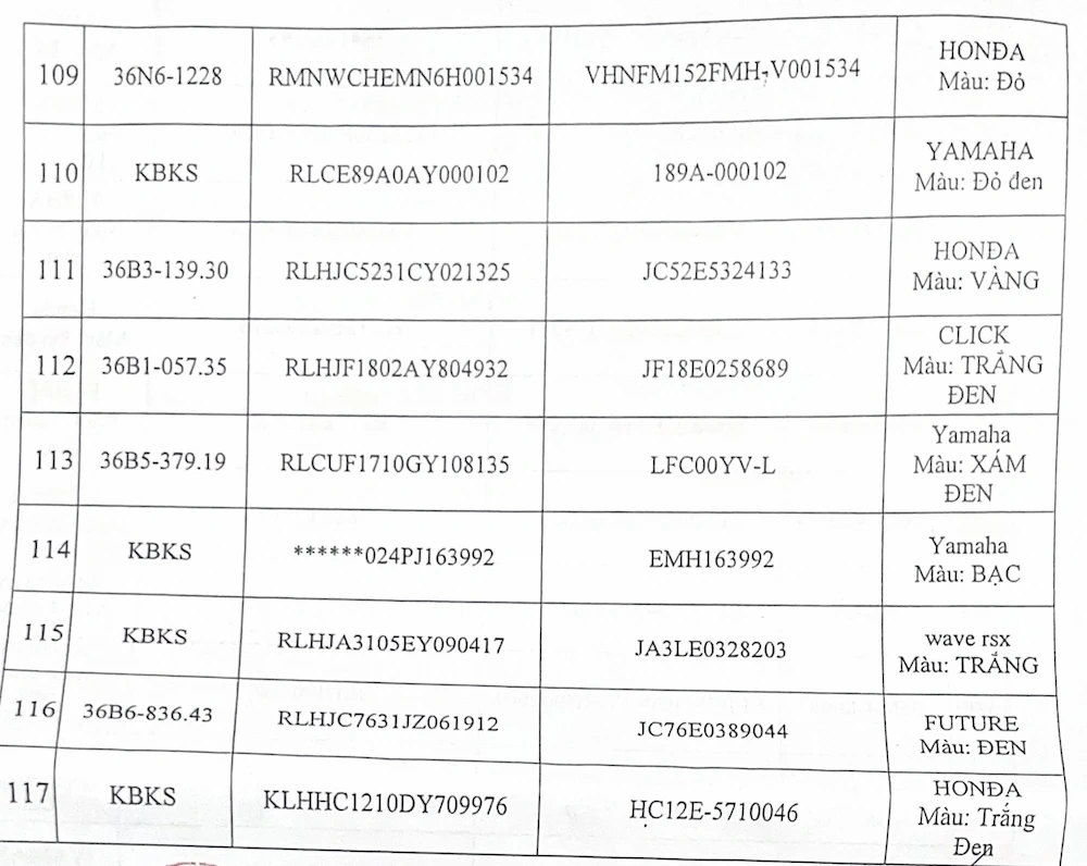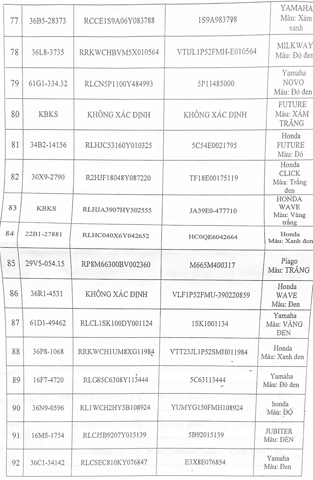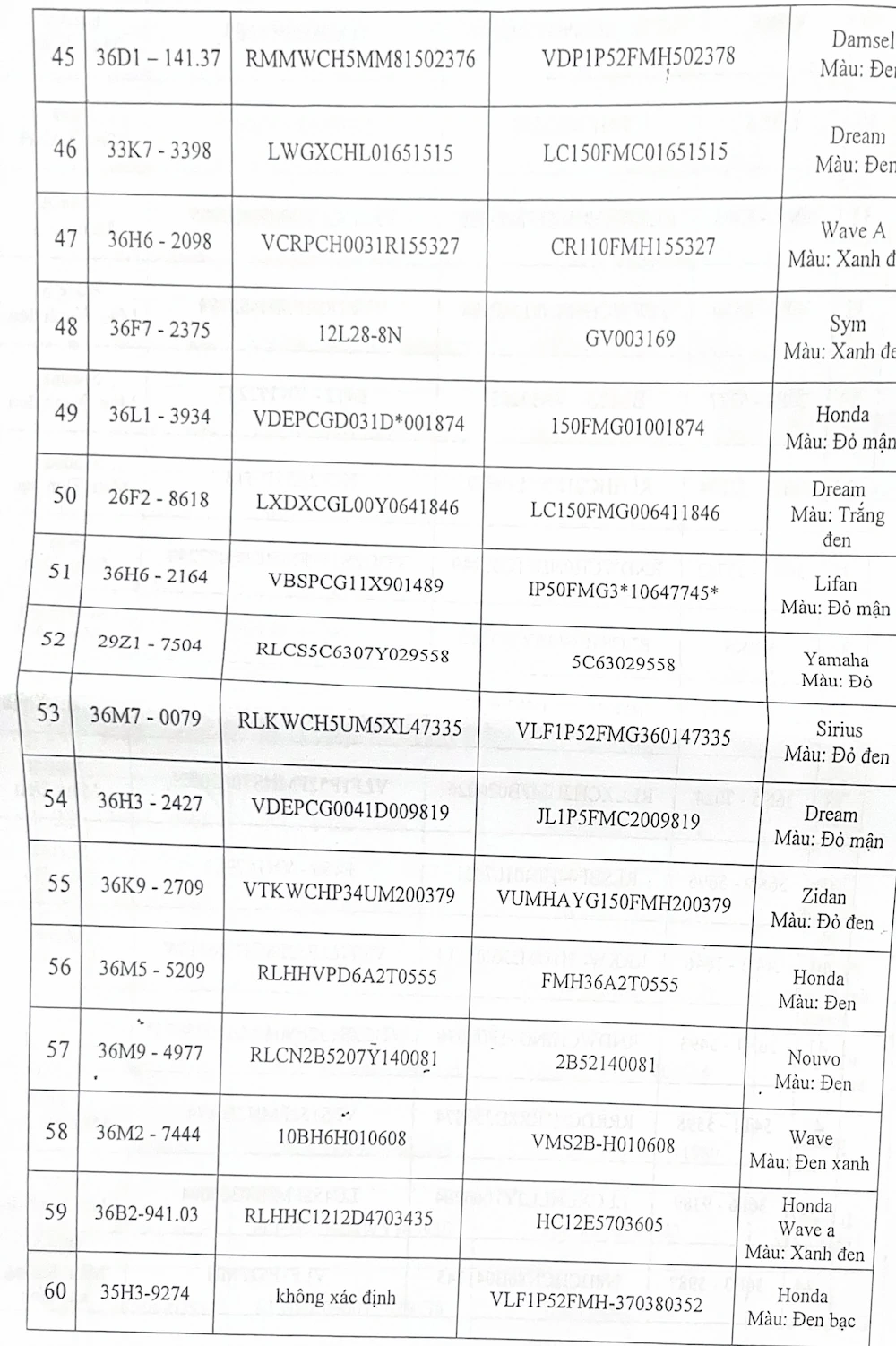 Trước đó, ngày 4/12/2025, Phòng Cảnh sát cơ động, Công an tỉnh Thanh Hóa đã ra thông báo lần 1 về việc tìm chủ sở hữu, người quản lý, người sử dụng hợp pháp đối với 117 phương tiện vi phạm hành chính trong lĩnh vực giao thông đường bộ đã quá thời hạn tạm giữ.