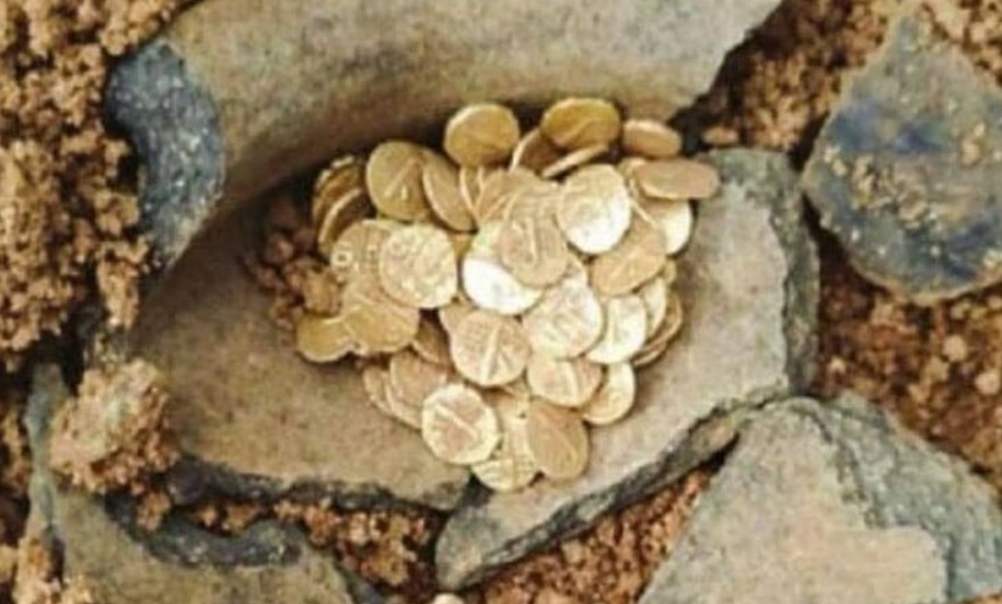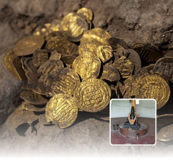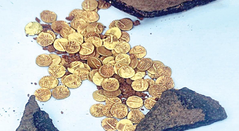 Khi đào bới bên dưới sàn đền, các chuyên gia tình cờ tìm thấy một hũ đất đã bị niêm phong và cất giấu suốt nhiều thế kỷ. Khi mở hũ ra, họ tìm thấy một bộ sưu tập đồng tiền vàng sáng bóng được xếp gọn gàng, được bảo quản tốt đến mức kinh ngạc bất chấp thời gian. Ảnh: @Bảo tàng Chennai.