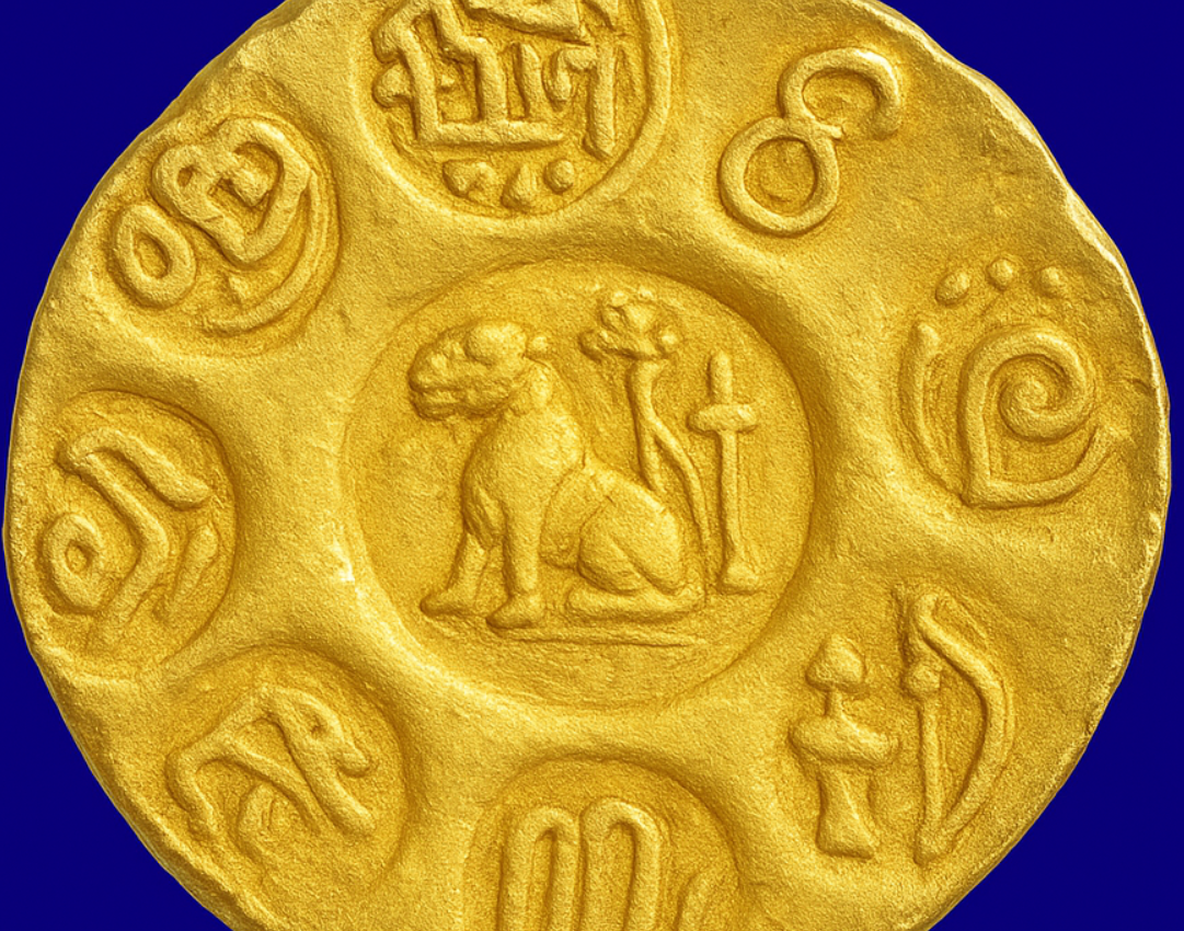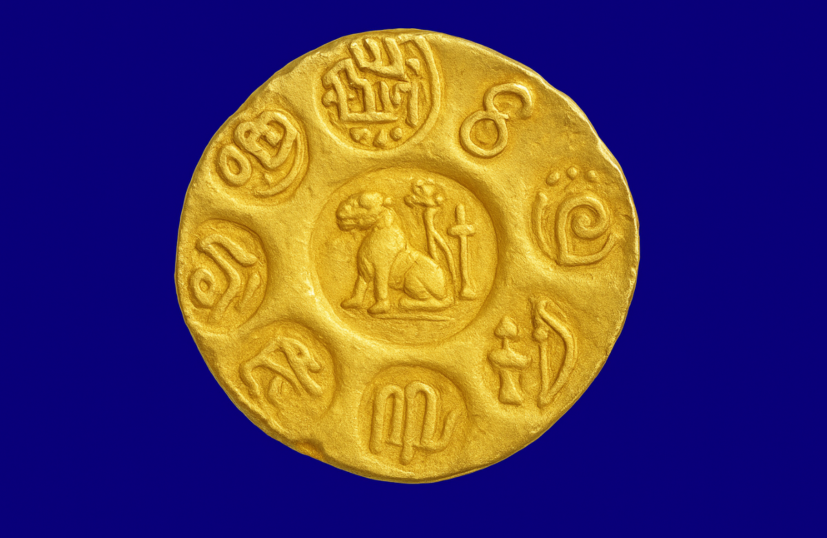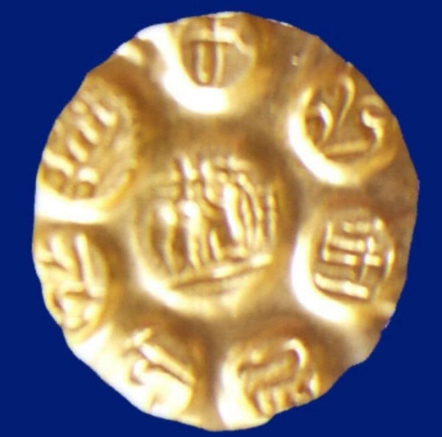 Những đồng tiền vàng này mang các biểu tượng như hổ hoặc cá, đại diện cho biểu tượng đặc thù của triều đại Chola. Ảnh: @Bảo tàng Chennai.