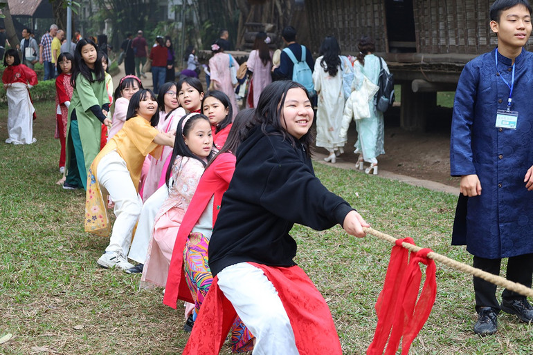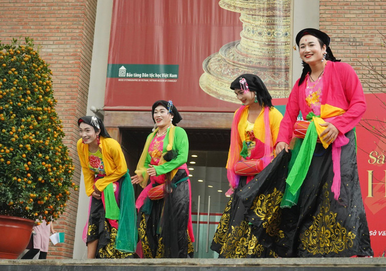 Khách tham quan cũng được trải nghiệm không gian Tết truyền thống với những hoạt động như viết thư pháp, nặn tò he, in tranh Đông Hồ, tô vẽ tranh 12 con giáp, múa sạp, tung còn, ném pao và nhiều trò chơi dân gian của các dân tộc…