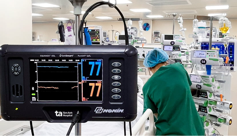 Máy theo dõi chỉ số tim mạch bệnh nhân sốc tim nguy kịch được nhân viên y tế túc trực liên tục, đồng thời thiết bị theo dõi độ bão hòa oxy trong mô tim theo thời gian thực (màu đen) được sử dụng cho chị Thơ ở khoa ICU - Ảnh BVCC