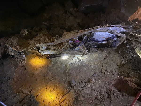 Chiếc xe bị vùi lấp dưới khối lượng lớn đất đá, biến dạng hoàn toàn, gây khó khăn cho công tác tìm kiếm, cứu nạn cứu hộ.