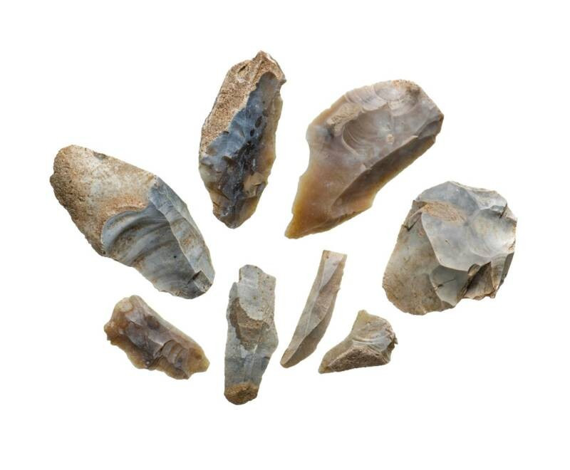 Khoảng 60 công cụ bằng đá lửa từ cuối thời Đồ đá giữa hoặc đầu thời Đồ đá mới. Những cổ vật này, có niên đại vào khoảng 4300 trước Công nguyên, được tìm thấy nguyên vẹn trong lớp cát bên dưới cung điện Westminster. Ảnh: R&R Delivery Authority.