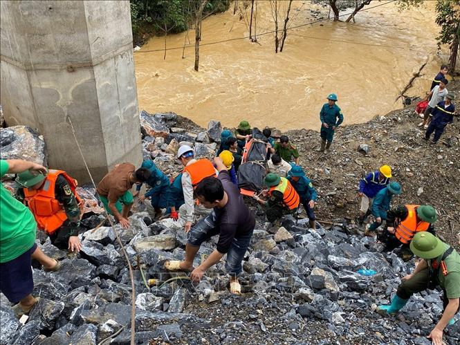 Các lực lượng chức năng nỗ lực tìm kiếm các nạn nhân mất tích do lũ quét. Ảnh: TTXVN phát