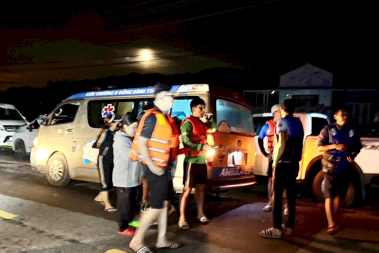 Xe cứu thương, lực lượng chức năng túc trực tại khu vực lũ quét ở Tuy Phong