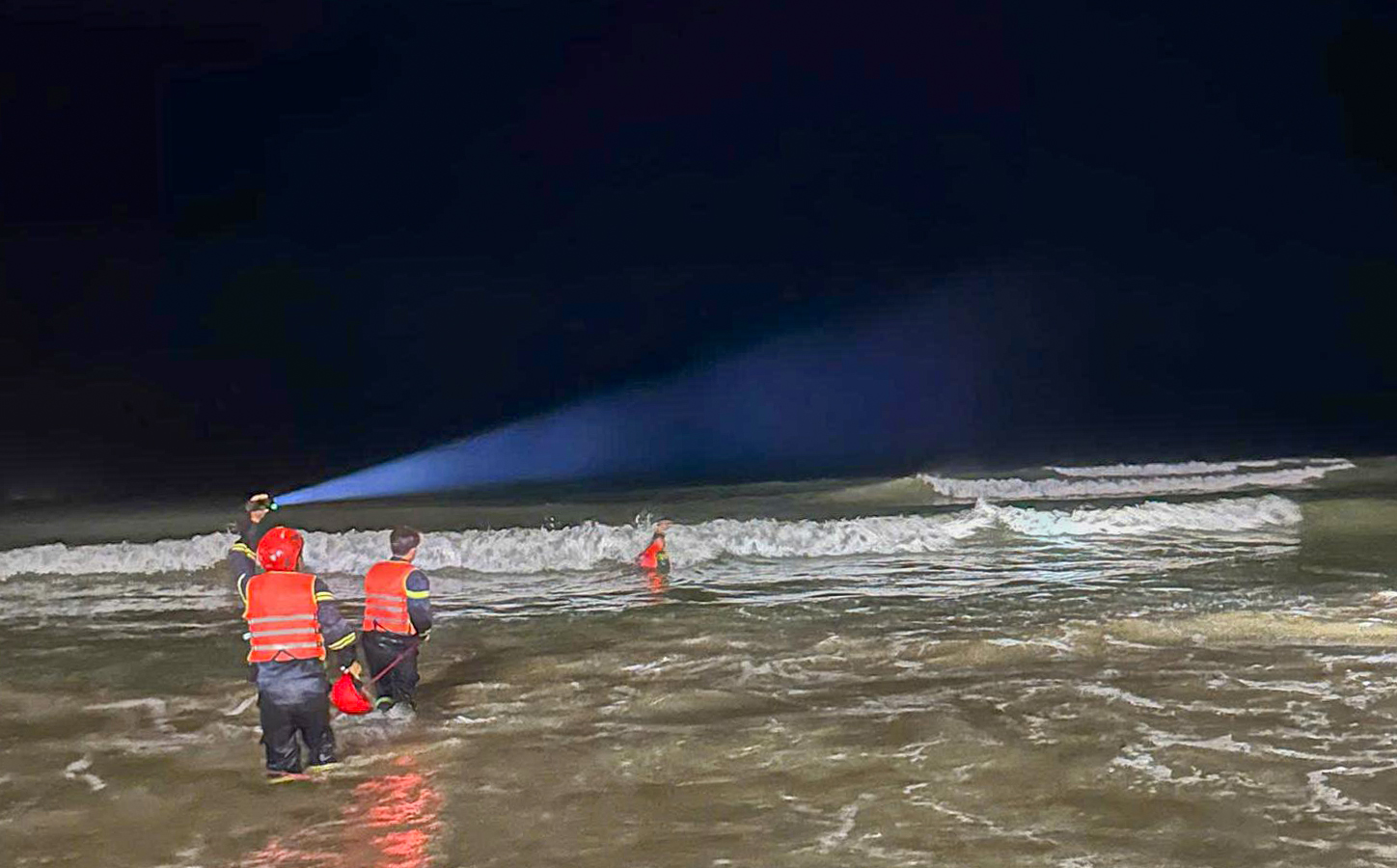 Lực lượng chức năng tìm kiếm nạn nhân bị sóng cuốn trôi. Ảnh: PC