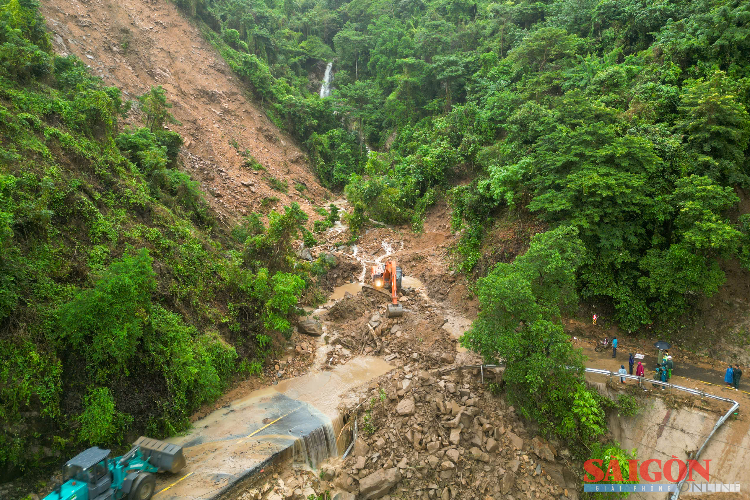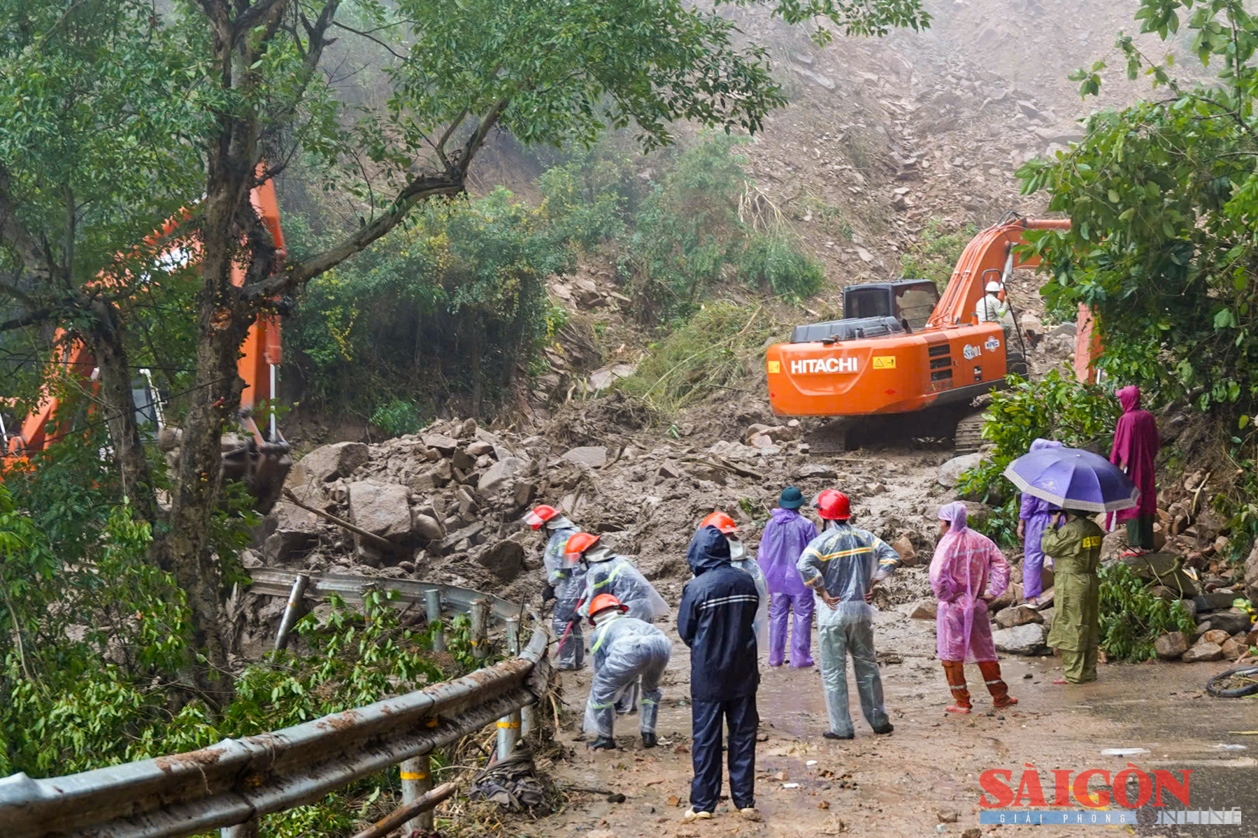 Đất đá tràn xuống đèo Khánh Sơn, chắn ngang mặt đường khiến giao thông tê liệt. Ảnh: HIẾU GIANG