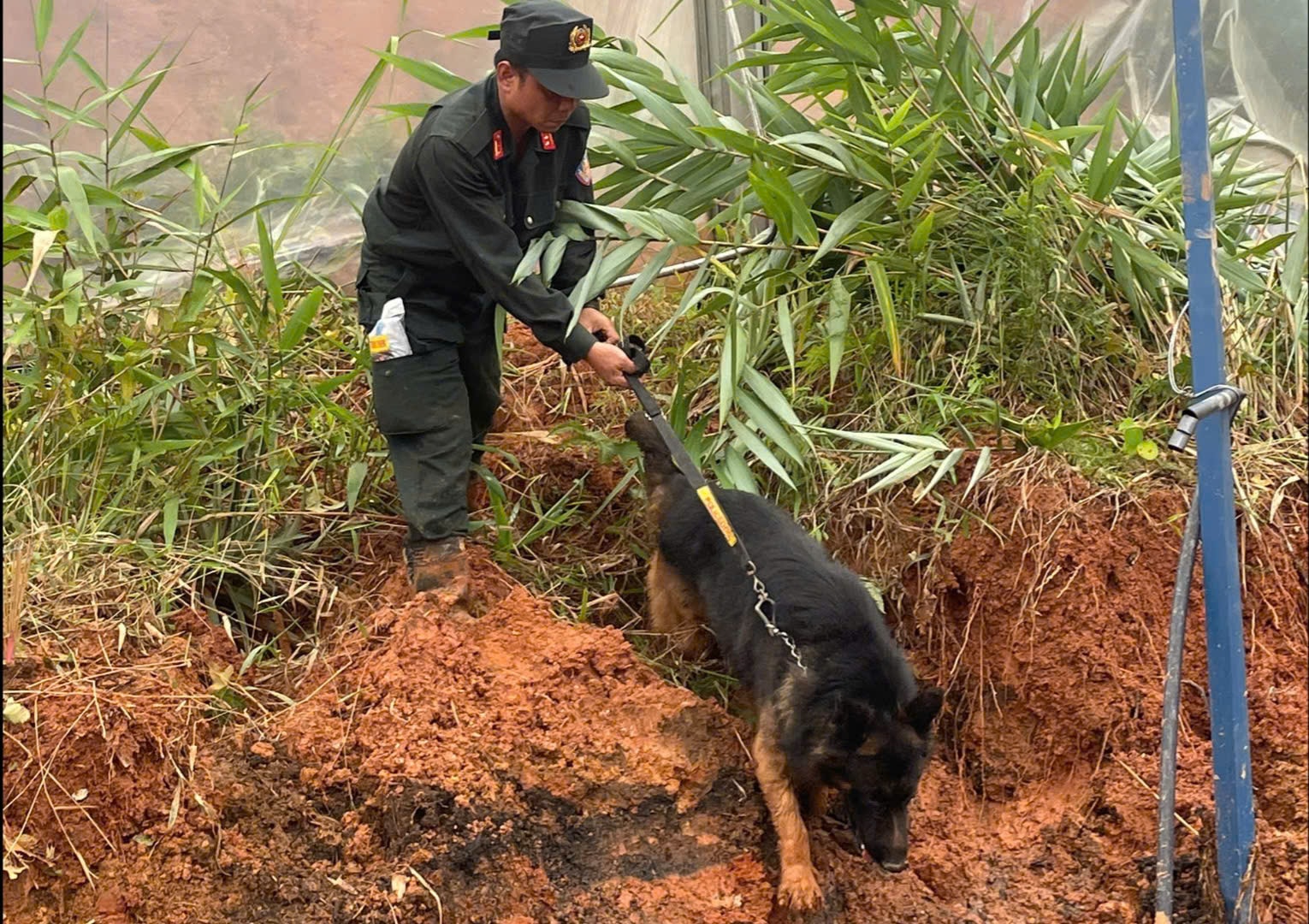 Lực lượng Cảnh sát cơ động sử dụng chó nghiệp vụ để tìm vị trí nạn nhân bị vùi lấp