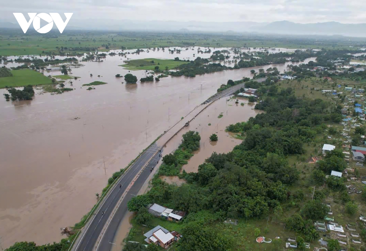 Tại khu vực xã Lương Sơn, tỉnh Lâm Đồng nước đổ về nhanh khiến mực nước sông Lũy dâng cao khiến nhiều khu dân cư và diện tích hoa màu của người dân bị ngập nặng.