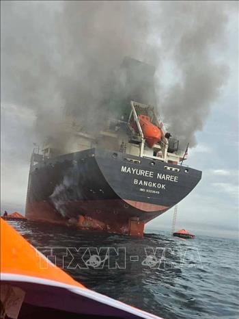 Khói bốc lên từ tàu chở hàng Mayuree Naree mang cờ Thái Lan sau khi bị tấn công ở eo biển Hormuz. Ảnh: TTXVN