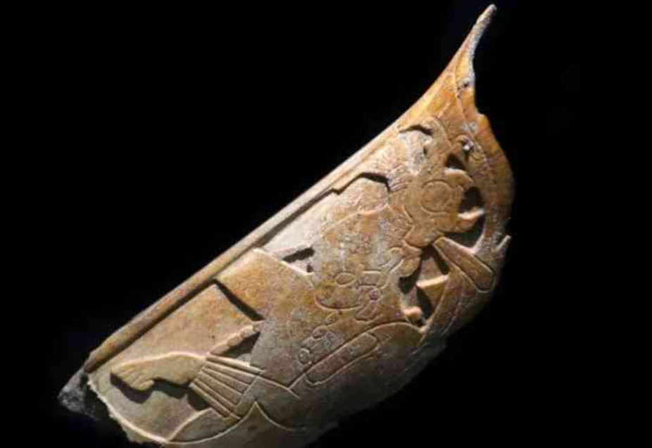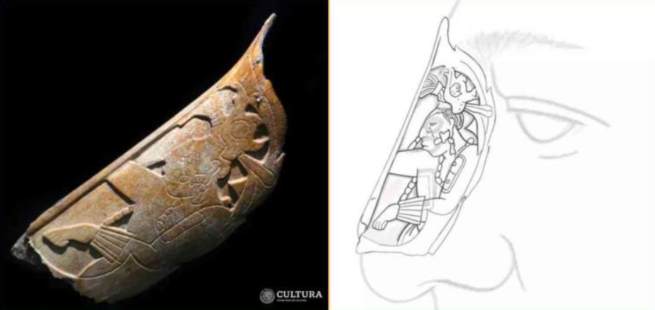 Trên mảnh xương trang trí mũi có khắc họa hình dáng một người đàn ông đội mũ hình chim. Ảnh: @Viện Nhân chủng học và Lịch sử Quốc gia Mexico.