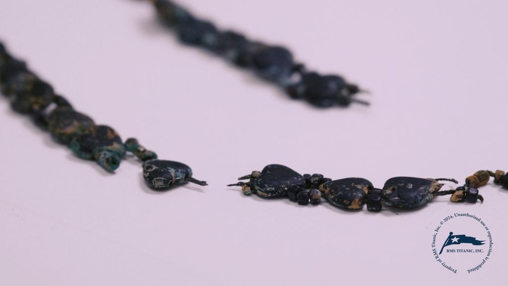 Do "ngủ vùi" dưới nước trong suốt nhiều năm nên các hạt trên chiếc vòng cổ dính đầy trầm tích và kết dính lại với nhau do áp lực nước mạnh dưới đáy đại dương. Ảnh: RMS Titanic, Inc.