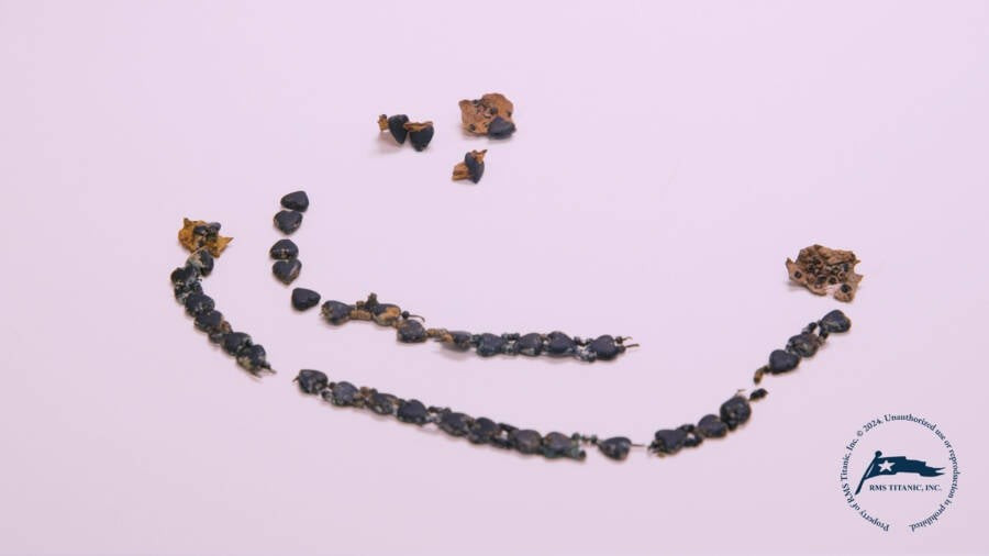 Điều các chuyên gia chắc chắn là chiếc vòng cổ là một món món đồ trang sức tang lễ thời Victoria. Phân tích các hạt trên chiếc vòng cho thấy chúng được làm từ một loại thủy tinh gọi là thủy tinh French Jet - loại thủy tinh mô phỏng đá quý và có giá thành phải chăng. Ảnh: RMS Titanic, Inc.