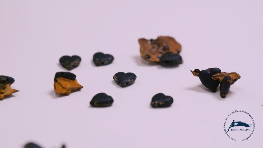 Theo các chuyên gia, chiếc vòng cổ gồm nhiều hạt nhỏ màu đen hình bát giác và hình trái tim. Một số hạt đã vỡ ra trong khi nhiều hạt vẫn còn nguyên vẹn. Ảnh: RMS Titanic, Inc.