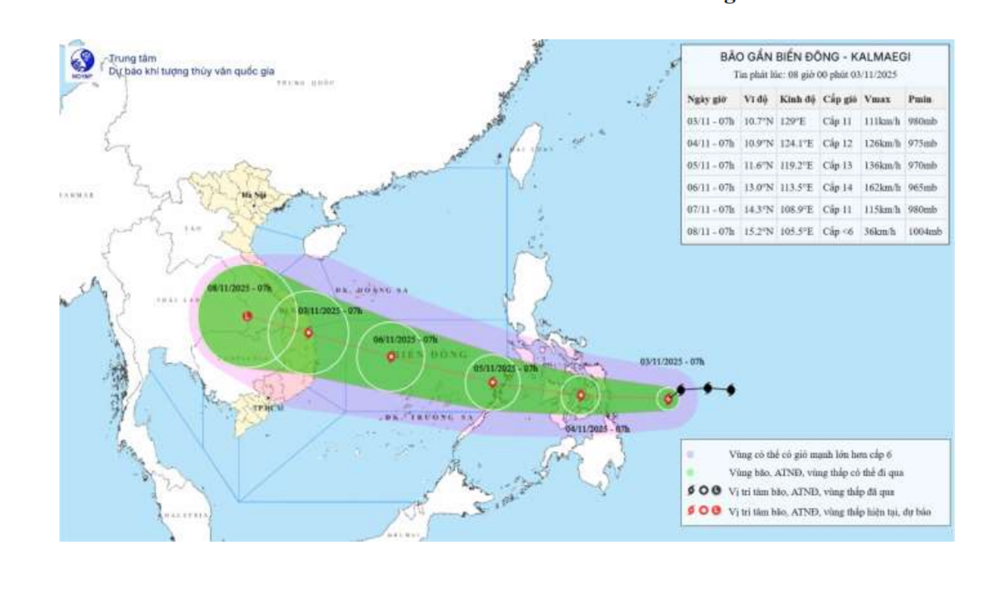 (ĐTO) Theo Đài Khí tượng Thủy văn tỉnh Đồng Tháp, hồi 7 giờ ngày 3-11, vị trí tâm bão KALMAEGI ở vào khoảng 10,7 độ vĩ Bắc; 129 độ kinh Đông, trên vùng biển phía Đông miền Trung Phillipines, cách tỉnh Đồng Tháp 2.444 km về phía Đông Đông Bắc; sức gió mạnh nhất vùng gần tâm bão mạnh cấp 11 (89–102 km/giờ), giật cấp 15, di chuyển theo hướng Tây với tốc độ nhanh khoảng 25km/h.