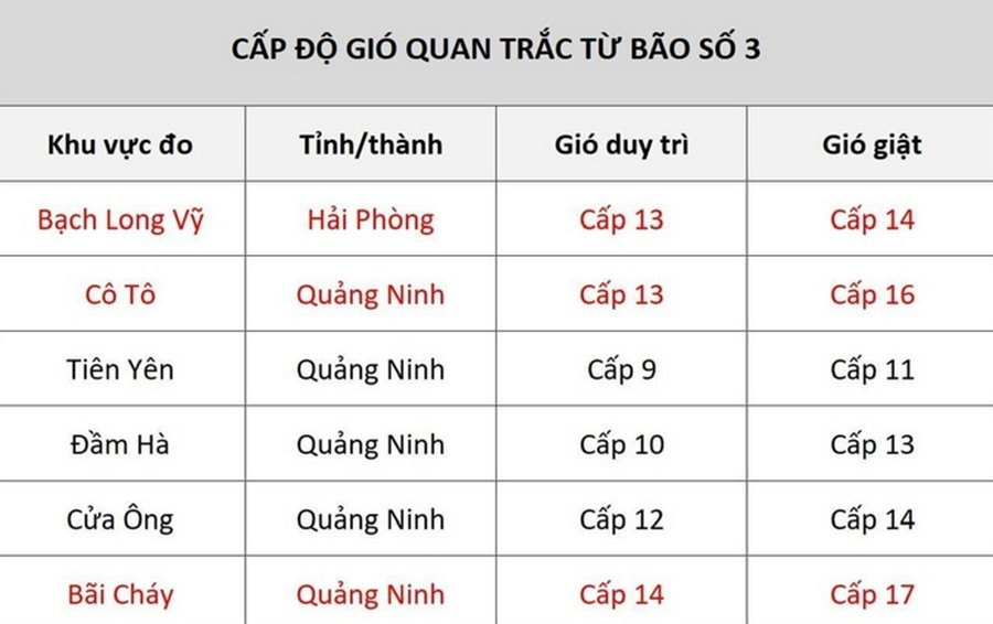 Cấp độ gió quan trắc từ bão Yagi (bão số 3 năm 2024), cập nhật đến 15h30' ngày 7/9/2024. Ảnh: Trung tâm Dự báo Khí tượng Thủy văn Quốc gia/ Đại biểu Nhân dân.