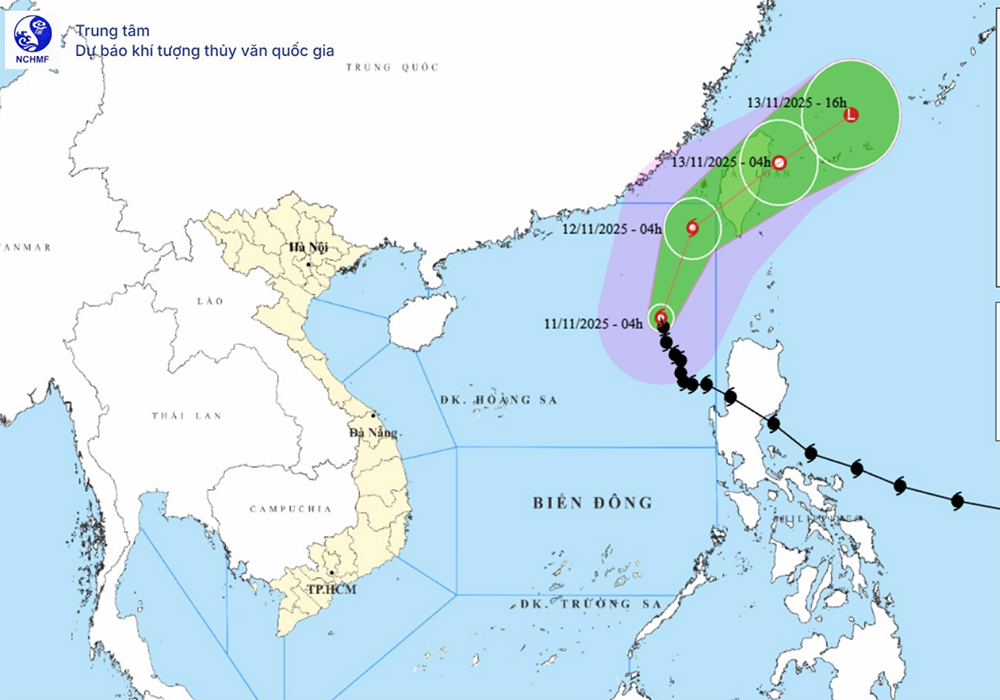 Khoảng 4h ngày 13/11, bão Fung-Wong trên vùng biển phía Đông đảo Đài Loan (Trung Quốc), đổi hướng Đông Bắc, tốc độ khoảng 15 km/h và suy yếu dần thành áp thấp nhiệt đới với cường độ cấp 7, giật cấp 9.