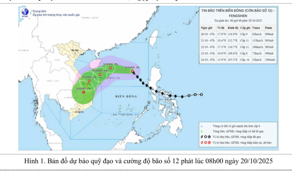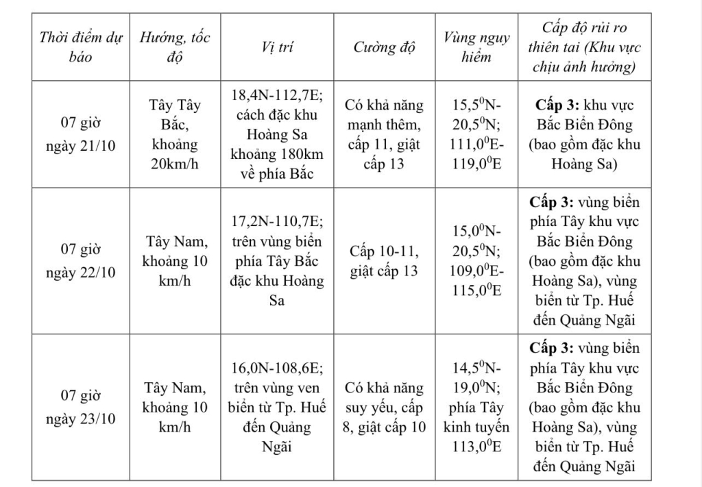 Trên đất liền: Do ảnh hưởng của hoàn lưu bão và không khí lạnh kết hợp nhiễu động gió Đông và hiệu ứng địa hình nên khoảng từ ngày 22 - 27/10 khu vực từ Hà Tĩnh đến Quảng Ngãi khả năng cao có mưa lớn diện rộng, kéo dài nhiều ngày, cục bộ có điểm mưa rất lớn, nguy cơ cao xảy ra lũ quét và sạt lở đất ở vùng núi, ngập lụt vùng trũng thấp và đô thị. Các địa phương cần lưu ý vận hành an toàn các hồ chứa thủy điện, thủy lợi trước, trong và sau bão, sẵn sàng phương án ứng phó với kịch bản lũ trên các sông từ Quảng Trị đến Quảng Ngãi có khả năng lên mức báo động 3 và vượt báo động 3.